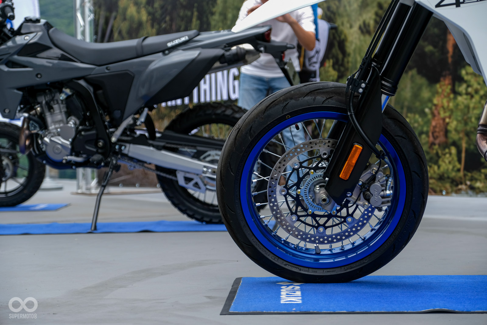 而 DR-Z4SM 明顯更吸引台灣民眾目光,針對街道與 Supermoto 場地玩家所設計,配備 17 吋滑胎專用鋼絲框,搭配 Dunlop Sportmax Q5A 運動胎,車高降低至 890mm,離地間隙亦相對降為 260mm,整體車架幾何重新優化,更適合街道靈活穿梭與場地極限操駕。