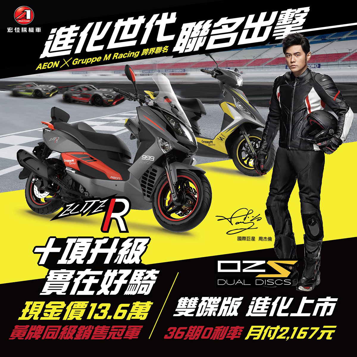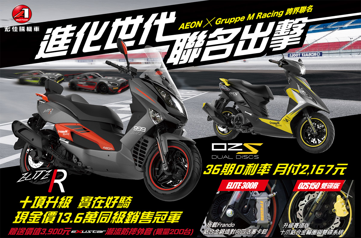 除了賽事贊助外,宏佳騰同時將兩款榮獲台灣精品獎的產品變身為聯名車款,而身為全台獨一無二與GT賽車聯名車在性能上的升級、外型設計皆不馬虎。設計上有黑與紅、黑與黃,兩款相呼輝映又不搶戲的主配色,再配上車號888、999,完全呈現精緻的賽車質感。性能方面,其中一款「OZS 150 Dual Discs」由前碟後鼓升級為雙碟版,再加碼賽道版十爪鋁合金輪框,只要月付2,167元,即刻輕鬆擁有。