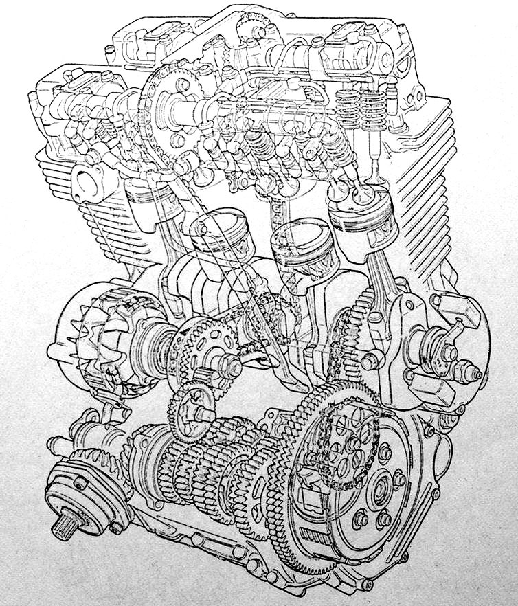 搭配的是六速常時嚙合式變速箱,傳動則使用巡航車少見、維護便利的 軸傳動(Shaft Drive)。另外還有油壓式離合器、油壓自動氣門間隙調整裝置,以及背面發電機(rear generator)這些配備,在當年可是頗有高級感的設定。