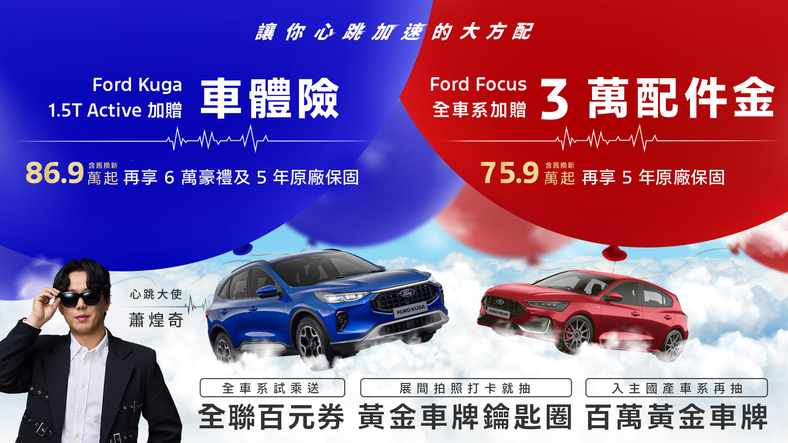 Ford延續車市暑期強檔銷售熱度,本月推出讓人心跳加速的「大方配」購車方案!自2025年8月1日起至8月31日止,至全台Ford展示中心試駕任一車款,即可獲得全聯百元購物金,展示間拍照打卡上傳Ford(TW)官方臉書粉絲團指定貼文可享限量黃金車牌鑰匙圈抽獎資格;凡入主國產車系,再享百萬黃金車牌抽獎機會!其中The All-New Ford Kuga歡慶突破5,000位準車主,1.5T車型舊換新86.9萬元起,加碼送出6萬豪禮,入主1.5T Active車型再享丙式車體險;New Ford Focus全車系享舊換新75.9萬元起,優惠期間入主國產車型贈送3萬元配件金;New Ford Ranger Wildtrak FRS Edition則是提供百萬0利率購車優惠,並額外加贈1萬元購車金及3萬元配件金;New Ford Tourneo Connect福特旅玩家,享有高額0利率購車優惠;於活動期間入主上述指定車型,皆享5年不限里程原廠保固;夏末不無聊,駕馭Ford冒險趣,一起抓住夏天的尾巴。