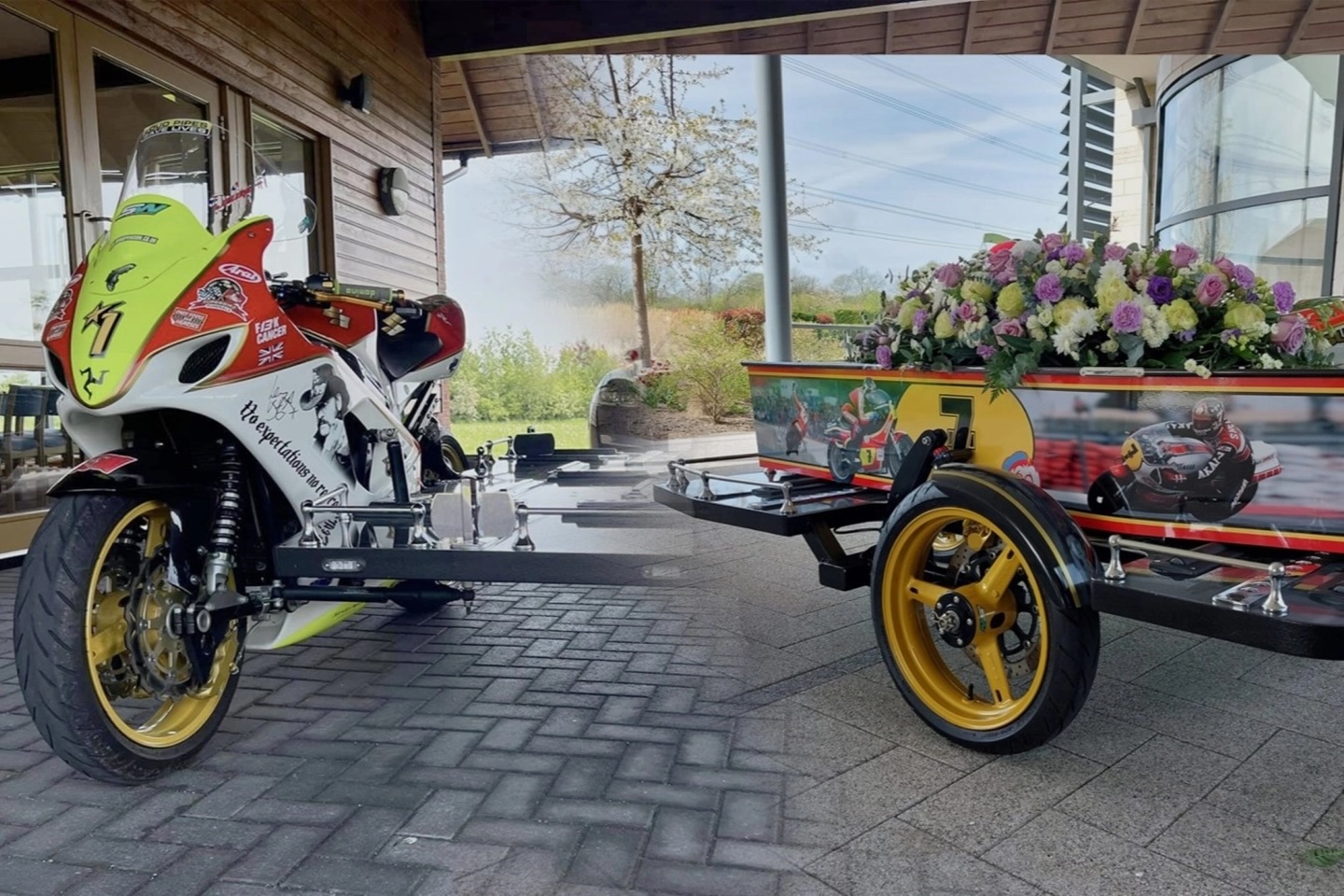英國蘭開夏郡的 Darren Abey 是一位超狂的重機迷,為了讓同樣熱愛機車的人「走得有型」,他打造了一台全球唯一的重機靈車,主體是一輛鈴木GSX-R1000 K4,旁邊接了一台專為棺木打造的特製邊車,看起來就像要上賽道一樣帥!