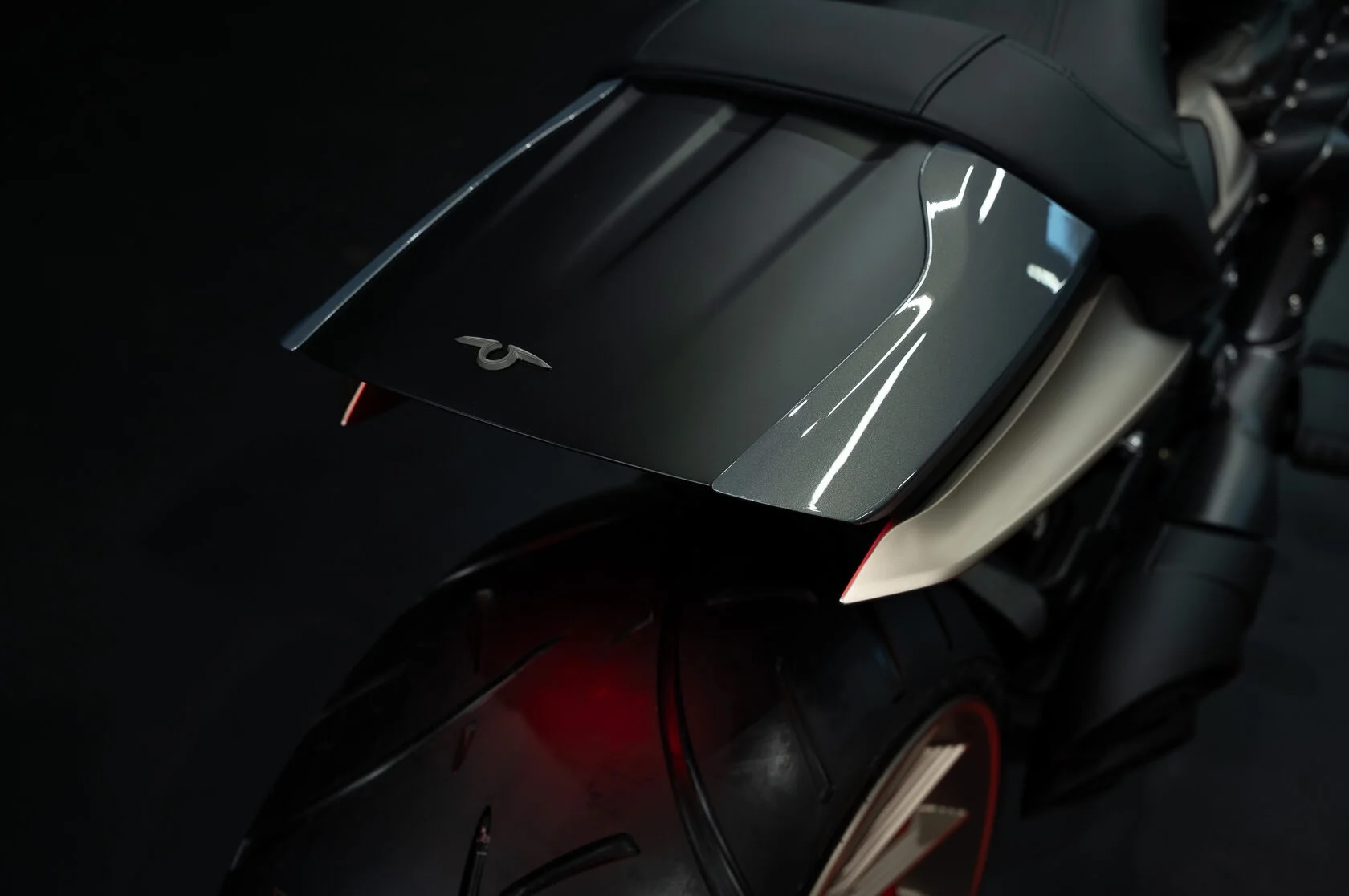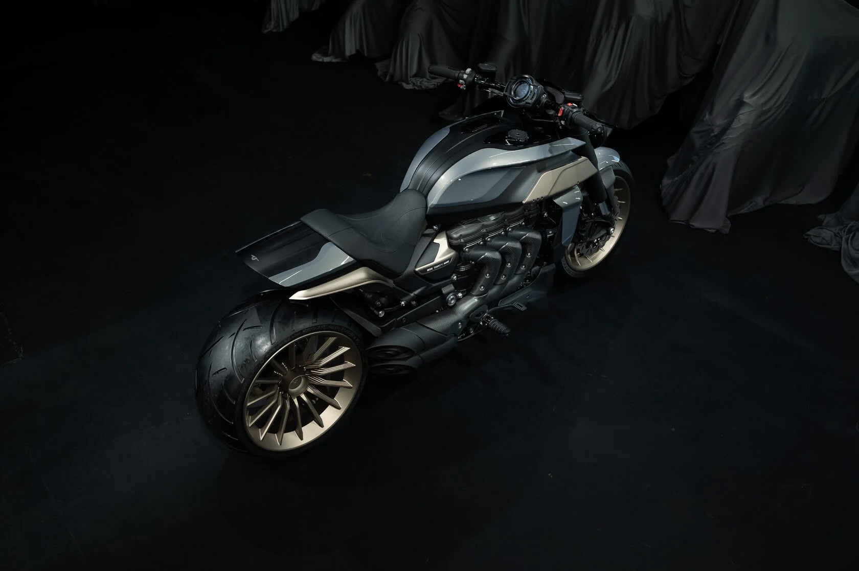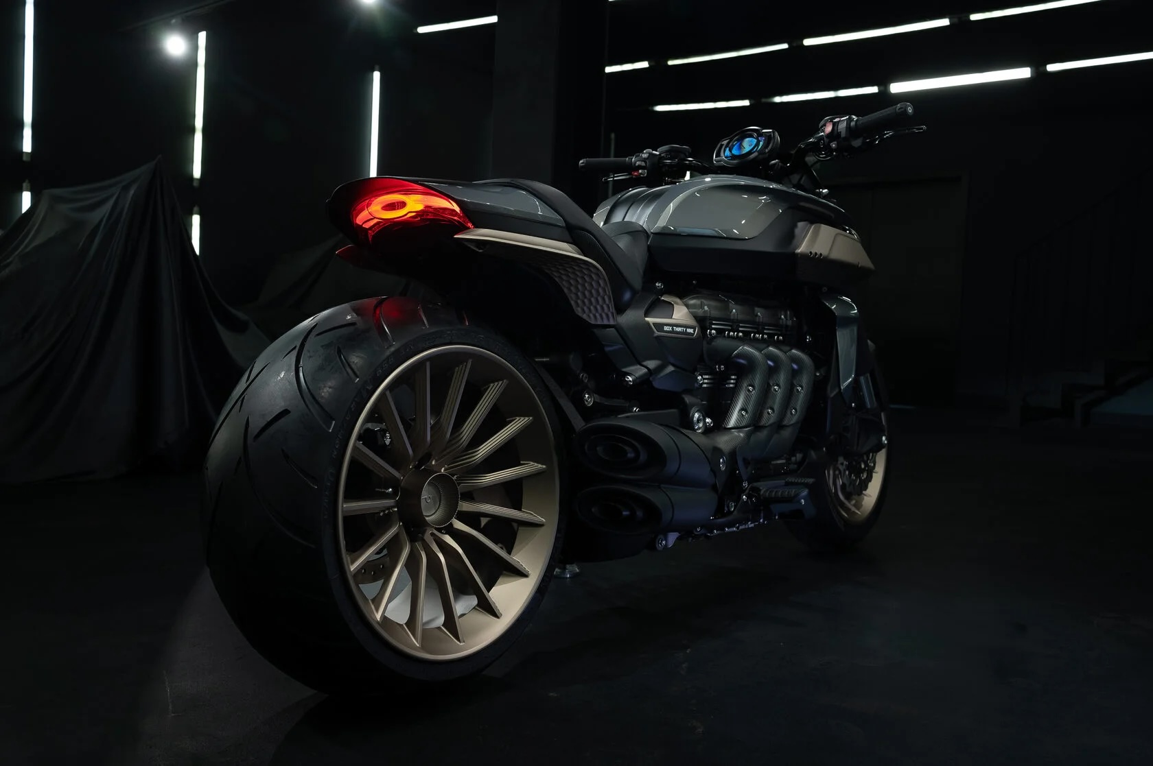 動力部分依舊保留原廠那顆 2,458c.c. 直列三缸引擎,180 匹馬力、275Nm 的暴力輸出照舊上身,不動引擎就已經夠狠。底盤改造才是重頭戲——自行設計加長的懸臂式搖臂結構讓後輪加寬到驚人的 280mm,前後輪圈同步升級為 18 吋,比例瞬間更霸氣。三角台與前叉護蓋也重新設計到宛如精品,細節更襯托 Rocket 3 經典的雙圓頭燈。
