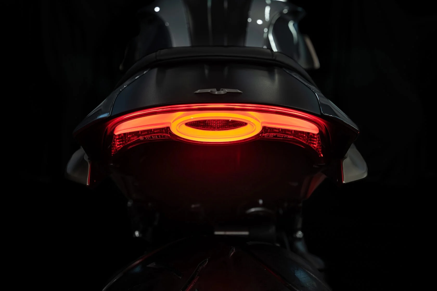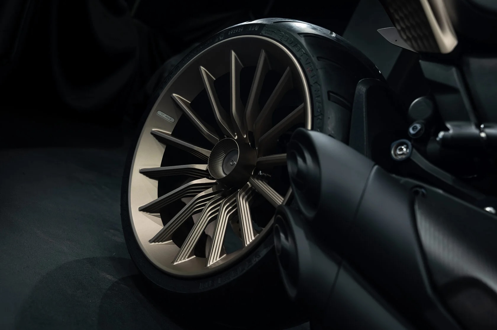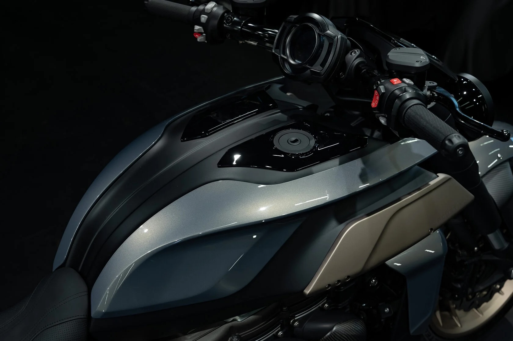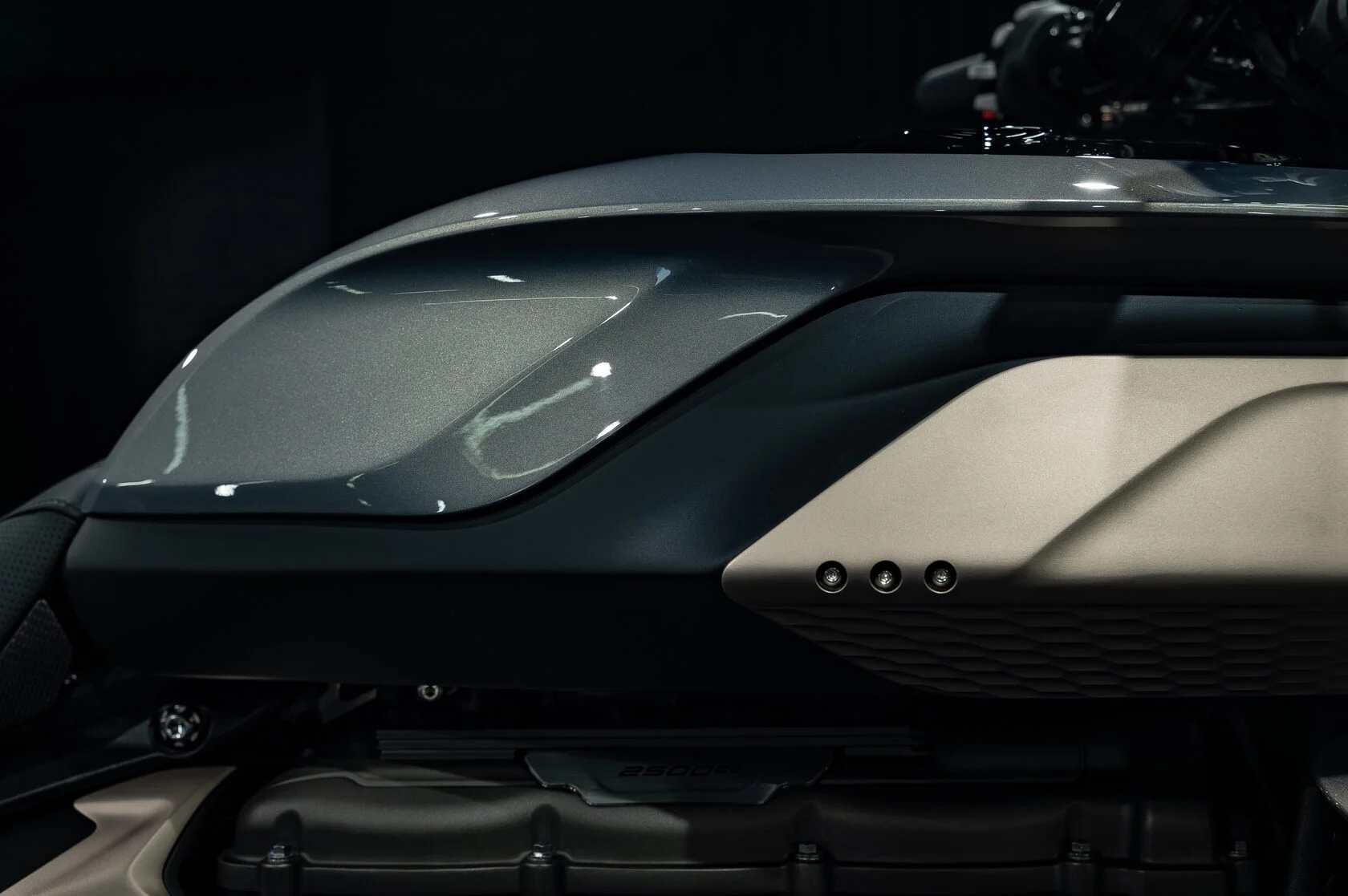 動力部分依舊保留原廠那顆 2,458c.c. 直列三缸引擎,180 匹馬力、275Nm 的暴力輸出照舊上身,不動引擎就已經夠狠。底盤改造才是重頭戲——自行設計加長的懸臂式搖臂結構讓後輪加寬到驚人的 280mm,前後輪圈同步升級為 18 吋,比例瞬間更霸氣。三角台與前叉護蓋也重新設計到宛如精品,細節更襯托 Rocket 3 經典的雙圓頭燈。