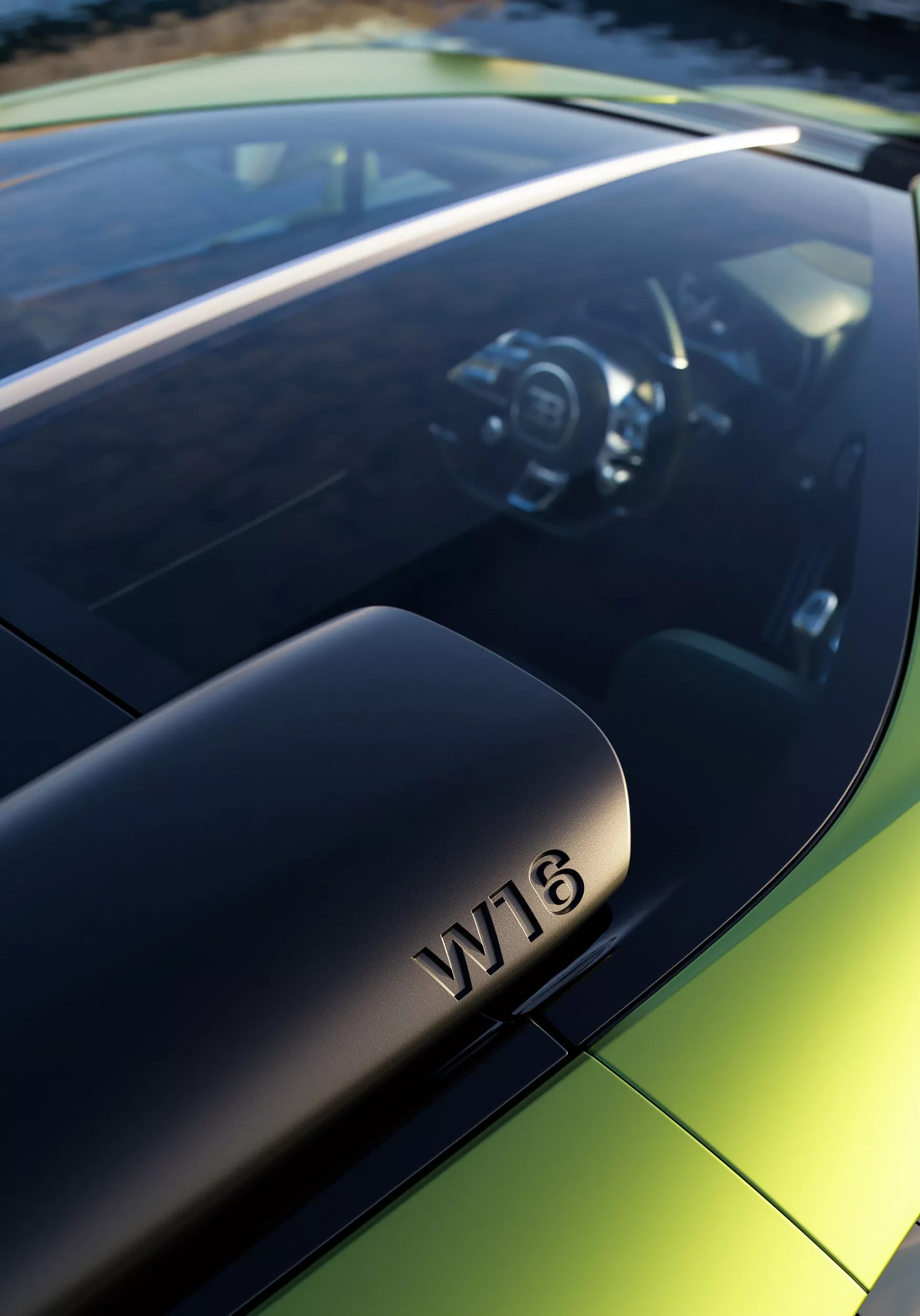 雖然整體座艙佈局延續 Chiron 的基礎設計,但幾乎每個細節都重新客製化。內裝主題以綠色為核心,搭配來自巴黎的專屬蘇格蘭格紋織布、綠色碳纖維,以及皮革與金屬切削鋁質飾件交織出獨特氛圍。最吸睛的亮點是排檔桿上的 Brouillard 馬雕塑,由工匠手工製作,封裝於透明玻璃內;門板與座椅靠背亦綴有馬匹刺繡,呼應車名的馬術靈感。