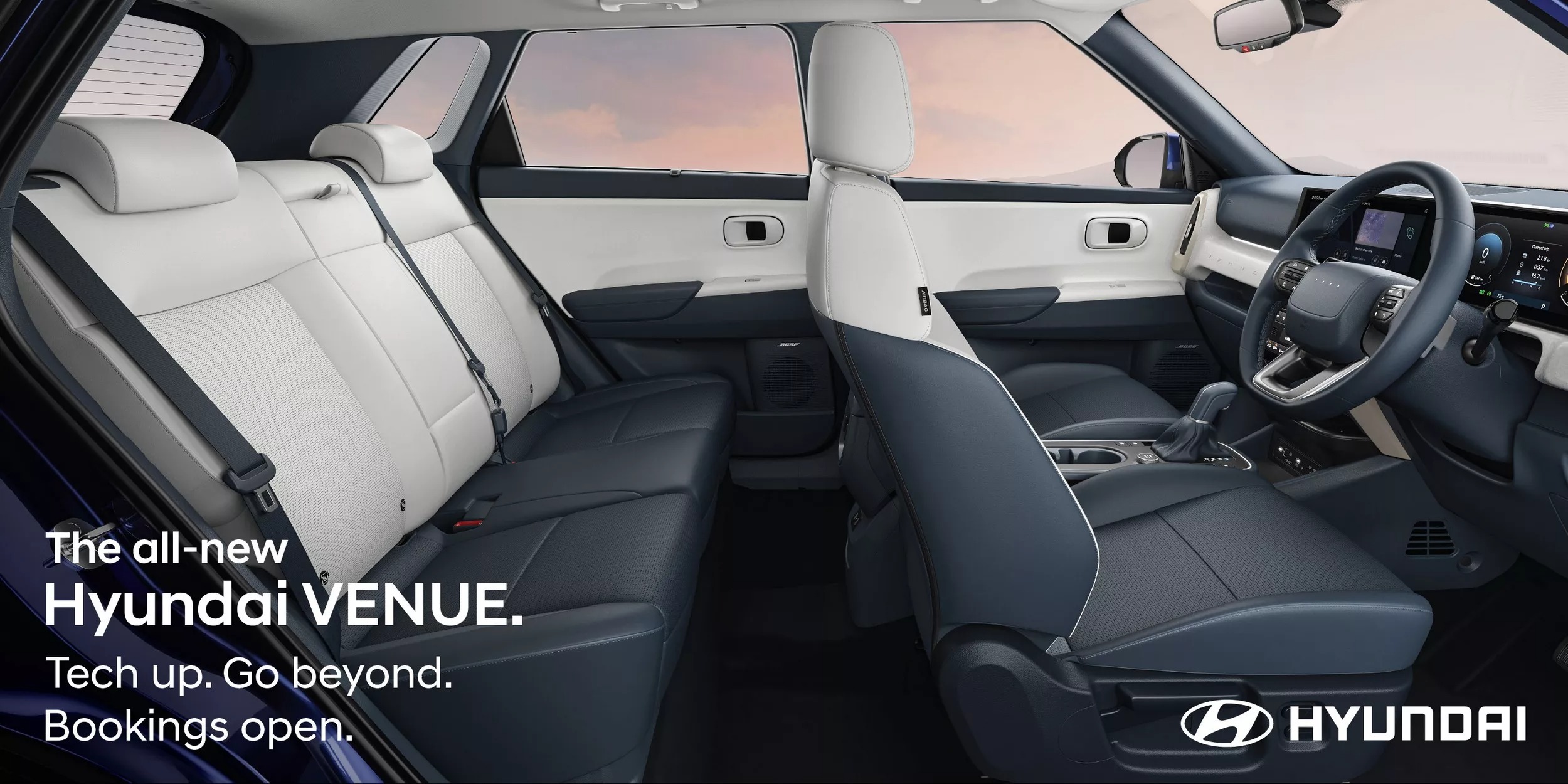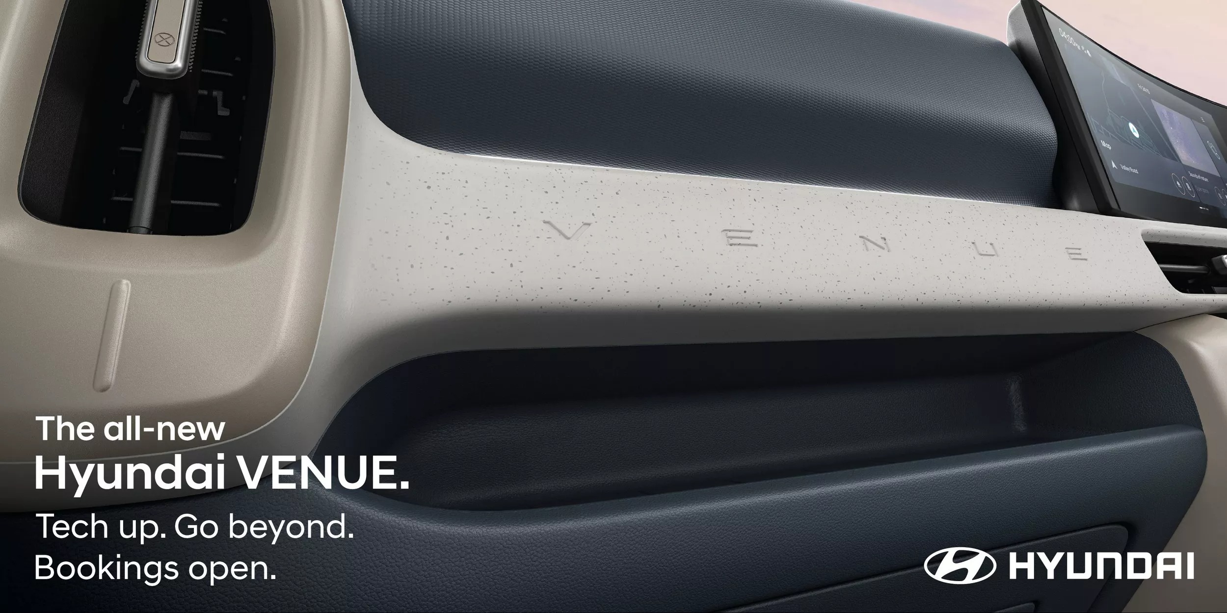 進入車內,全新Venue最大的亮點即為雙12.3吋數位螢幕構成的弧形一體式中控顯示,包含數位儀表與中央多媒體系統,視覺效果與操作科技感十足。全新設計的冷氣出風口、Venue字樣飾板,以及重新規劃的中控按鍵區域,讓介面更清爽易用。方向盤採用類似Ioniq 5的四點式徽飾設計,營造更具品牌識別度的氛圍。