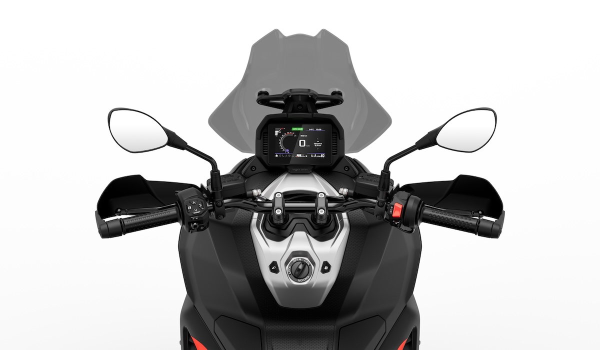 車頭配置三元素 LED 頭燈組,這是 Aprilia 運動車系的經典特徵;上方懸浮式風鏡可進行五段高度調整,兼具視覺張力與實用性。車側則以立體開孔強化肌肉感,腳踏區融入越野防護板的結構語言。