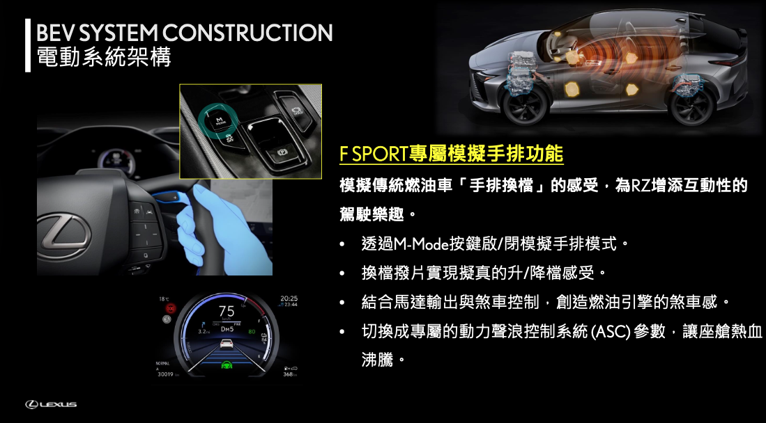 本次改款最令人津津樂道的,莫過於專為 F SPORT 版本開發的 M-Mode 模擬手排功能 。為了打破電動車單速行駛的乏味感,Lexus 導入了模擬燃油車換檔的互動機制 。透過專屬的 ASC 動力聲浪控制系統,結合馬達輸出與煞車控制的精密配合,當駕駛撥動換檔撥片進行「降檔」時,車輛會模擬出引擎煞車的頓挫感與聲浪。
