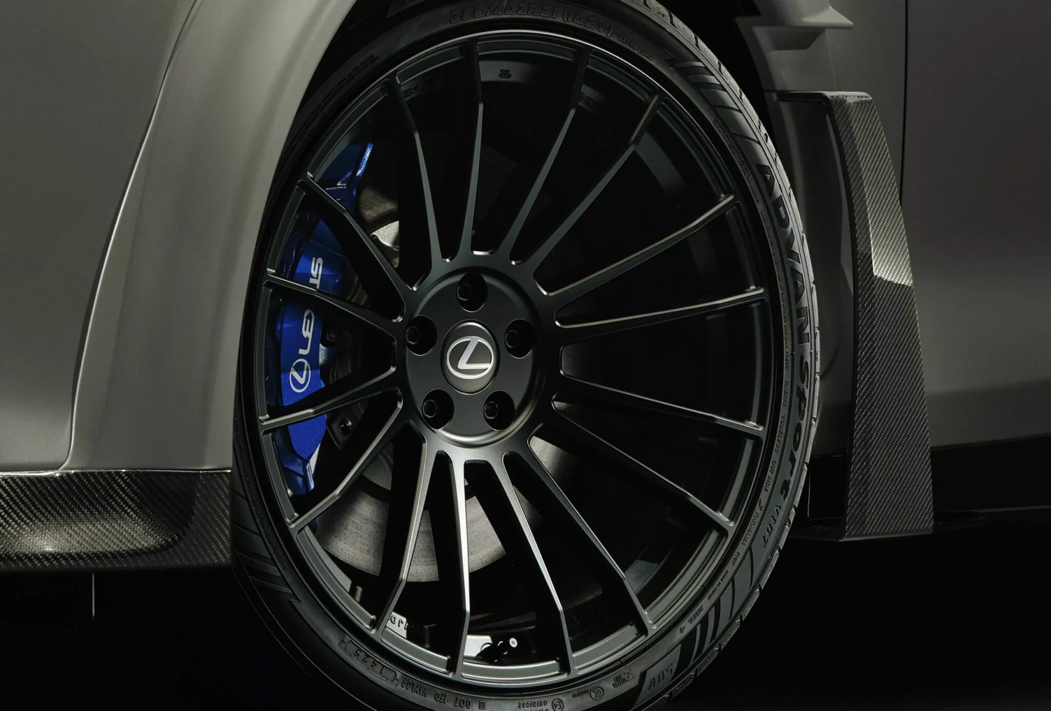 為了匹配其性能定位,新車提供了「中微子灰(Neutrino Gray)」與「白銀二號(Hakugin II)」兩種雙色車身選擇,並大量點綴裸露的碳纖維紋路與藍色飾條。底盤部分則換裝 21 吋 Enkei 消光黑輕量化鋁圈,內部升級為對向六活塞鋁合金單體卡鉗與 20 吋大尺寸碟盤,車身高度也較一般 F Sport 版本降低了 20mm,呈現更為低趴的跑格姿態。