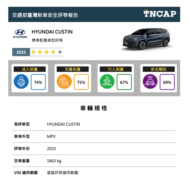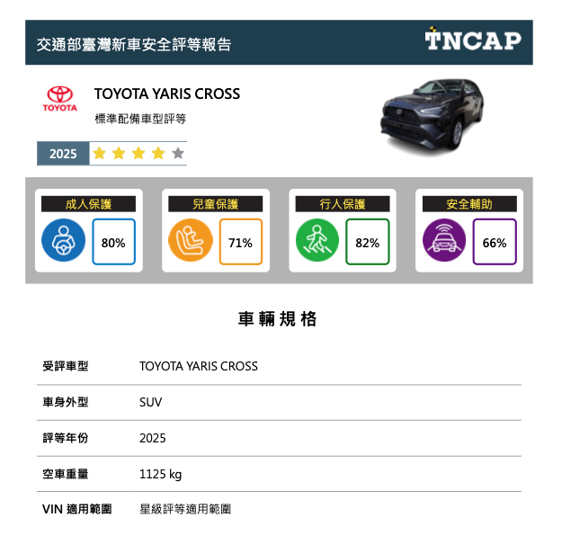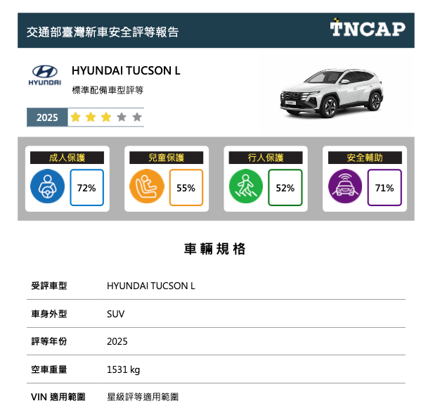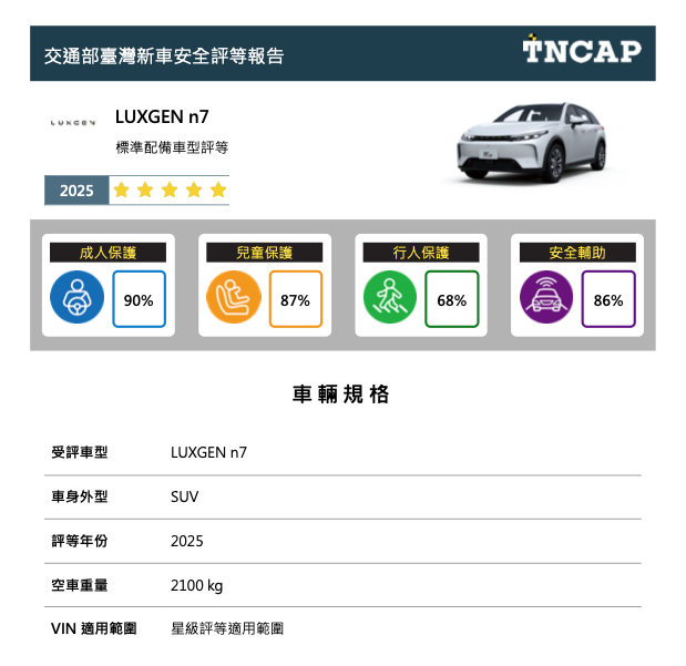 今(114)年 9 月30 日公告三車型 TNCAP 評等結果後,財團法人車輛安全審驗中心針對第四季四車型(HYUNDAI CUSTIN、HYUNDAITUCSON L、TOYOTA YARIS CROSS 及 LUXGEN n7),依「交通部執行臺灣新車安全評等作業要點」及「交通部臺灣新車安全評等規章」執行 TNCAP 主動、被動安全評等試驗,辦理完成計分及轉換星級評等,結果說明如下,其中 TOYOTA YARIS CROSS 及 LUXGEN n7 車型首次分別選擇交通部新增指定的西班牙 IDIADA 及美國 CALSPAN國外檢測機構執行試驗,國內外送測作法皆一致,均依 TNCAP 規章辦理,展現業界對 TNCAP 制度的認同,亦代表 TNCAP 與國際作法接軌,持續邁向國際化,本次揭露四車型評等詳細內容可至 TNCAP 專屬網站參閱相關安全資訊(網址https://www.tncap.org.tw/SafetyRatings/):