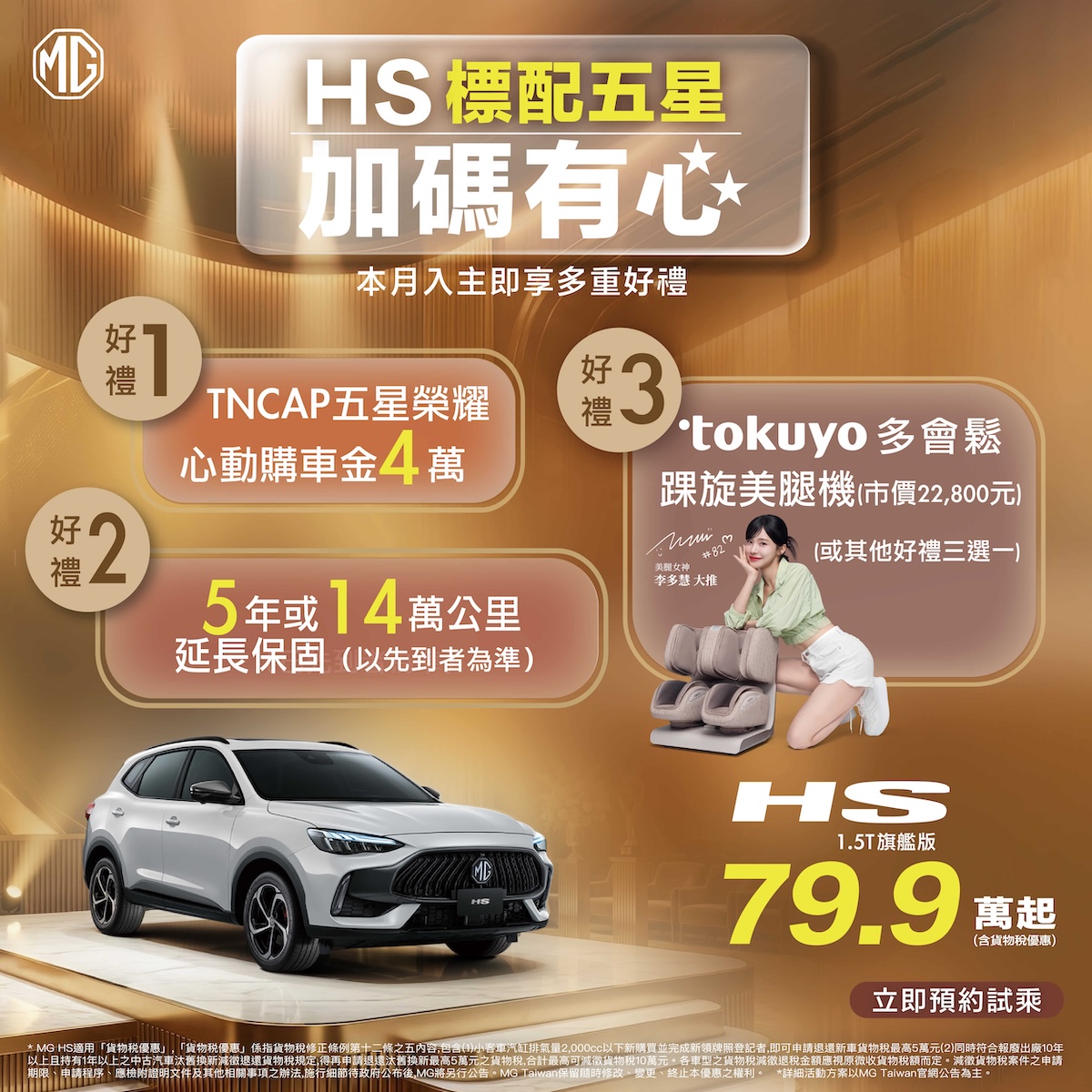 MG Taiwan在1月同步推出專屬購車優惠,全車系受惠於貨物稅新購減徵,HS車系搭配舊換新補助後最低79.9萬元起、ZS車系59.9萬元起、G50 PLUS 98.5萬元起,HS車型更提供五星榮耀心動購車金最高4萬元,本月完成領牌還可享有第五年延長保固(價值15,000元),為新年換車兼具安全與價值的最佳首選。