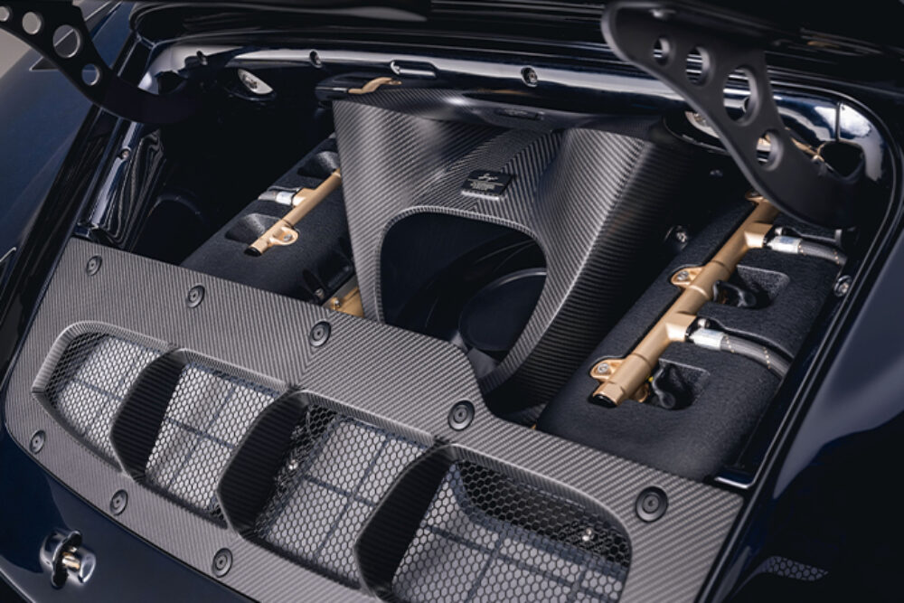 車身完全由碳纖維製成,並經 CFD 最佳化,Sorcerer 選用了賽道版套件,包括深前擾流、寬體輪拱與大型尾翼。外觀塗裝為 Fantasia Blue 漸層色,搭配香檳金色的 19 吋前輪與 20 吋後輪鎂合金中鎖式輪圈。內裝則以 Pebble Grey 皮革座椅為基礎,中央覆以 Pearl Grey Alcantara,並以香檳色飾邊點綴,浮動式錶盤設計宛如高級腕錶,營造出獨特的工藝氛圍。
