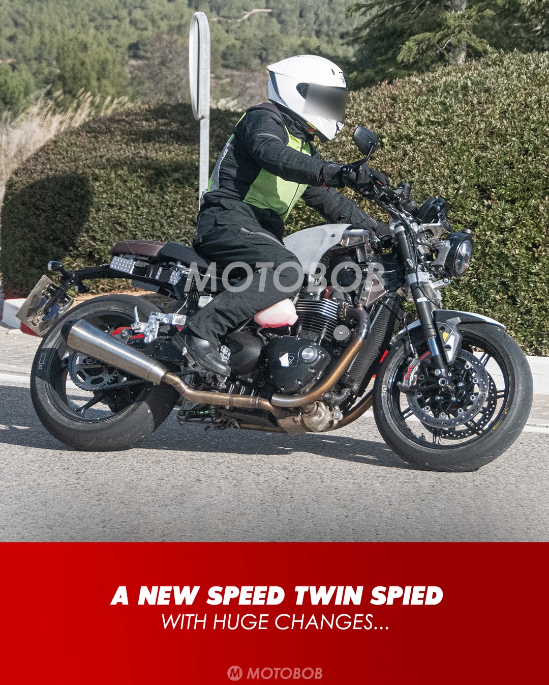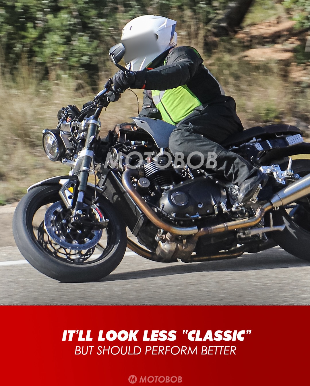 這次被拍到的測試車最讓人驚訝的絕對是那副「大換血」的車架,凱旋這次看來是狠下心要把 Speed Twin 1200 徹底現代化,他們捨棄了過往復古車標配的雙搖籃車架,轉而採用更現代化的車架設計,讓引擎本身直接承載車身剛性。這種做法通常能大幅度減輕重量,並提升車輛在彎道中的極限反應。