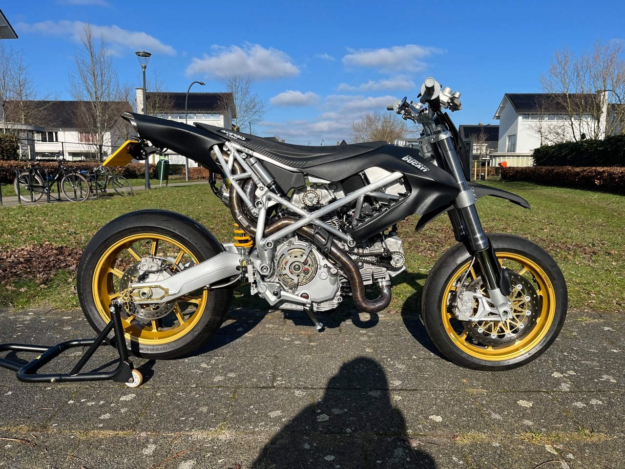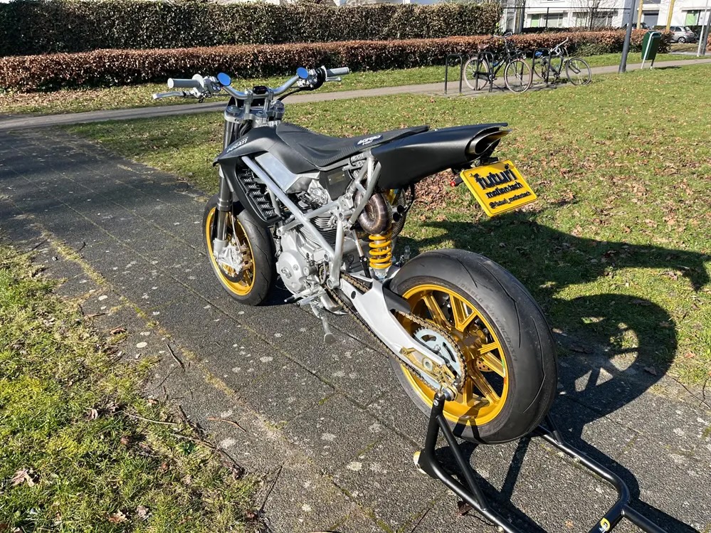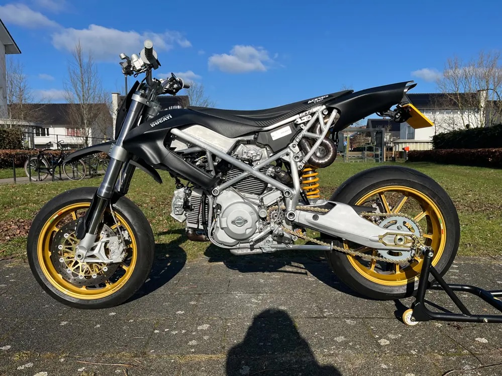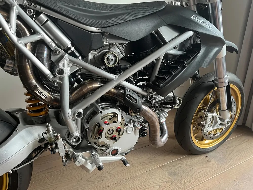 動力核心植入 Multistrada 1100 的 V 缸引擎,換上輕量化曲軸、賽車凸輪軸並流用 1098 仿賽變速箱。底盤採用全新鋁合金車架搭配初代 999 雙搖臂、Hypermotard 1100 前叉,後方更搭載具備自製電子阻尼調整的 Öhlins 避震,並配備 17 吋 Marchesini 鍛造鎂合金輪框。