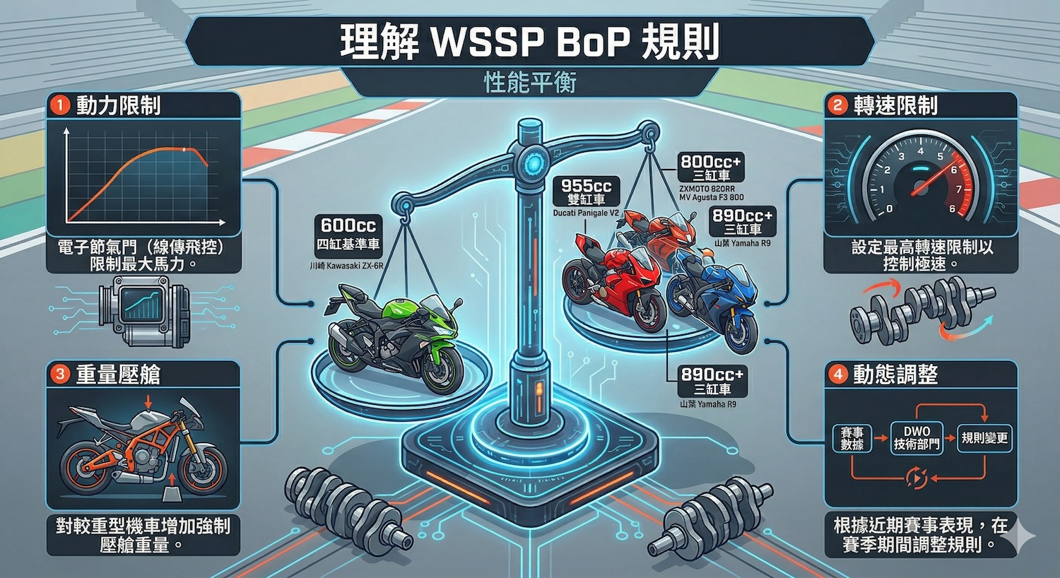2026 年 WSSP 採用性能平衡(BoP)公式,對於 800c.c. 級距三缸引擎的馬力圖譜限制相對寬鬆。