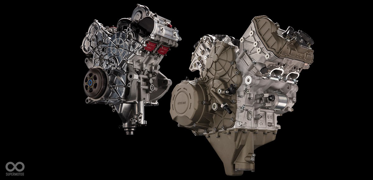 Desmosedici Stradale V4大量採用源自MotoGP的技術,甚至在活塞的尺寸上也都同為81mm,但衝程更長來到了53.5mm,而壓縮比更是高達14.0:1,比先所發表的任何車款都還要來得更高,引擎的夾角維持在經典的90º,並且用上了反向曲軸設計,讓這台車在操控時能較不受到陀螺效應的影響,除此之外這顆引擎的點火間隔也相當特別,使用的是0º-90º-290º-380º的配置,這70º的偏移讓後輪擁有更佳的循跡性,讓打滑發生時不至於持續的喪失抓地力,概念與HONDA今年用於RC213-V的技術相近,而DUCATI稱之為“twin-pulse”引擎。