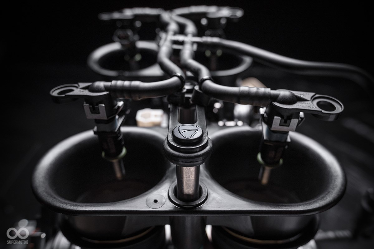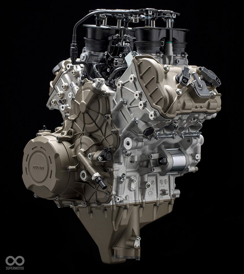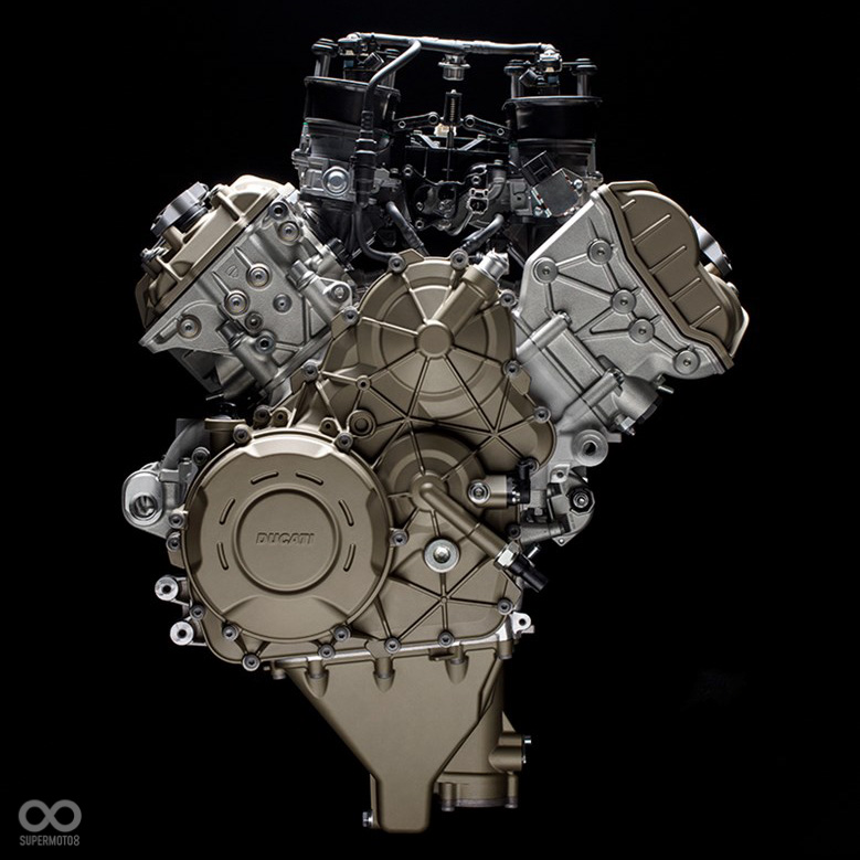 此外Desmosedici Stradale V4同樣使用了Desmodromic汽門與半乾式油底殼設計,據原廠工程師說法,這顆引擎可以輕鬆地承受14,000rpm的轉速,而進氣、點火、供油更是全方面的更新,新引擎換上了52mm的橢圓形進氣道,並且導入可變進氣岐管與雙噴油嘴技術,讓這顆引擎無論在低轉還是在高速都能夠保有優異的動力表現。