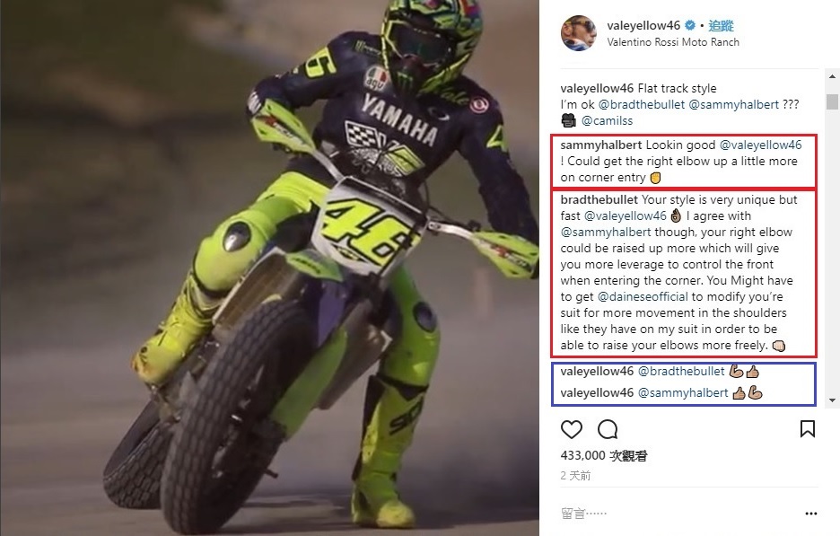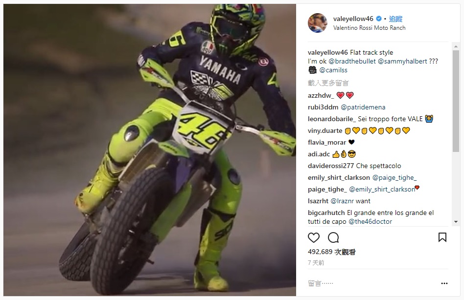 就在前幾天,Rossi 把自己騎滑胎車的一小段影片放上instagram,一旁寫著 "Flat Track Style I’m ok???" 像你我這種一般人看到應該都會覺得很帥,頂多按個讚或在留言稱讚,沒想到留言串裡有個傢伙不知哪來的自信,直接留言說Rossi 的姿勢不對,應該要擺成怎樣比較好。