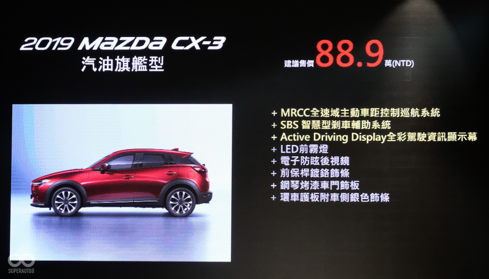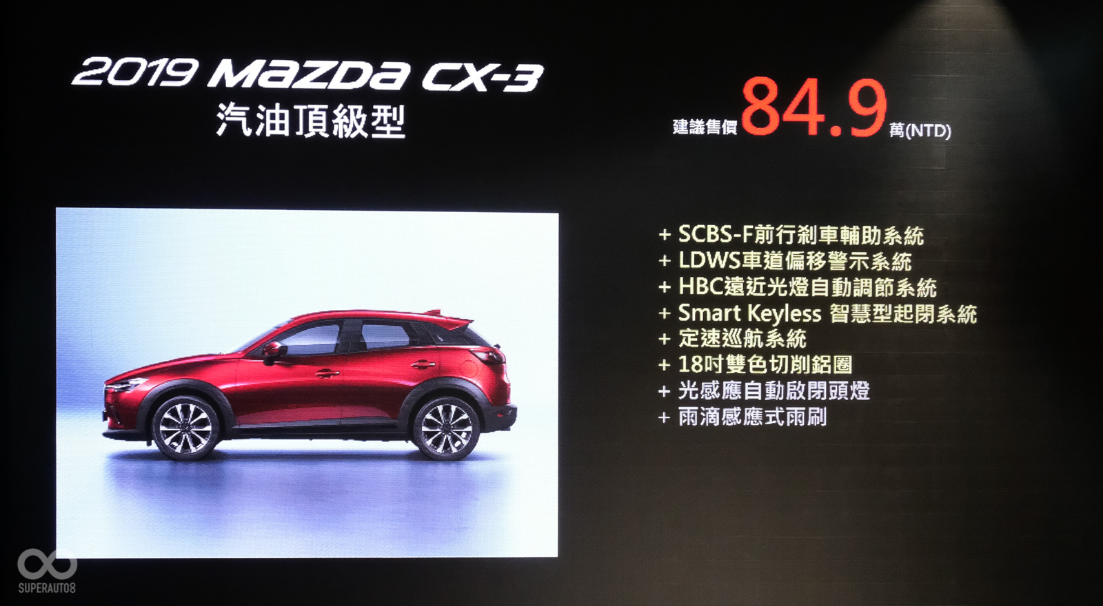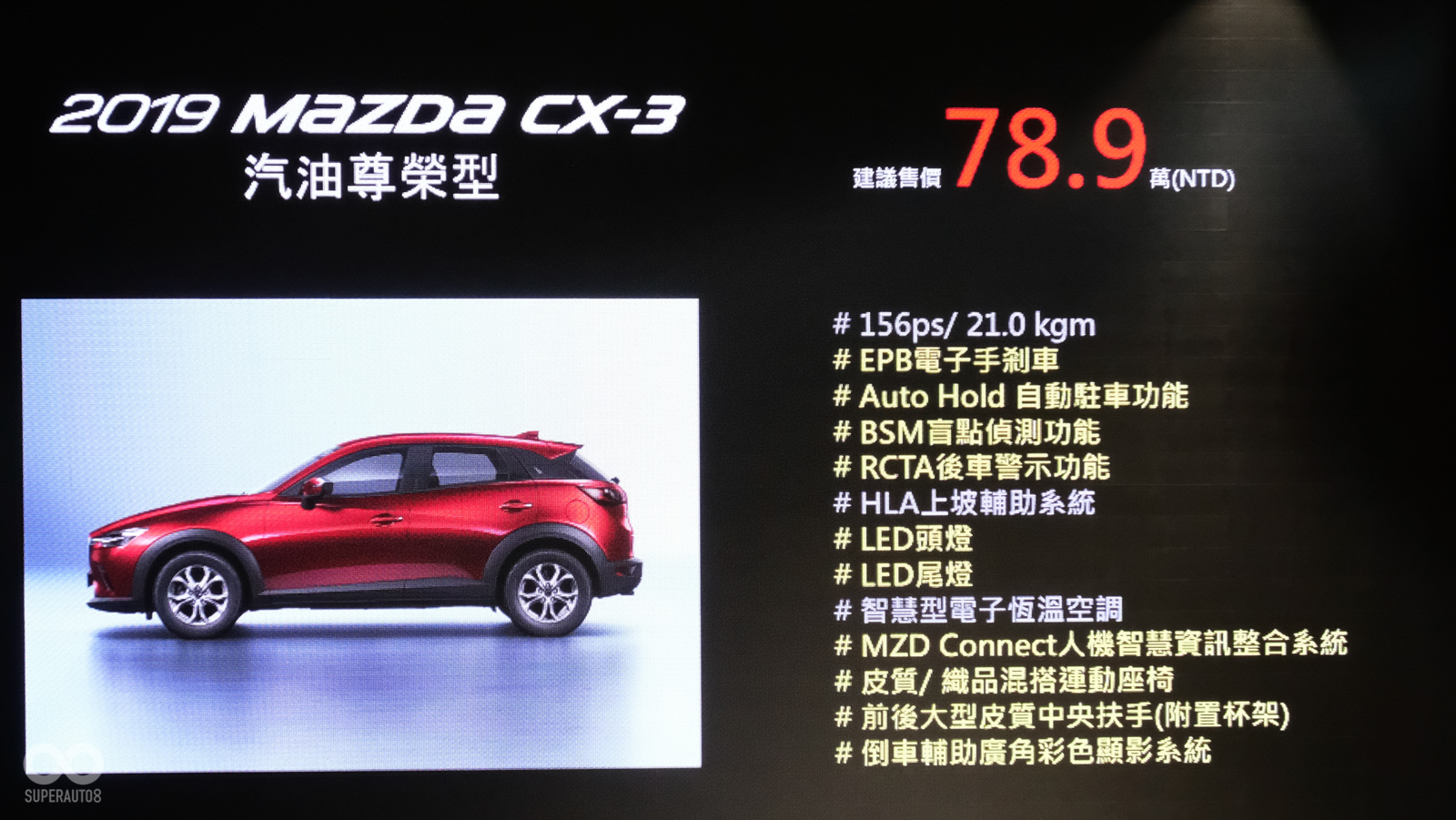 2019 MAZDA CX-3以獨特魅力開創都會跑旅新級距,自上市以來在進口小型SUV中已佔了三成的銷售量,2019 MAZDA CX-3除了外觀質感的提升外,另外新增了MRCC全速域主動車距控制巡航系統,提升車輛的安全性,2019 MAZDA CX-3具備SKY-G 2.0汽油車型與SKY-D 1.8柴油車型,並以新台幣78.9萬起開始接單,提供令消費者驚豔的駕馭體驗。