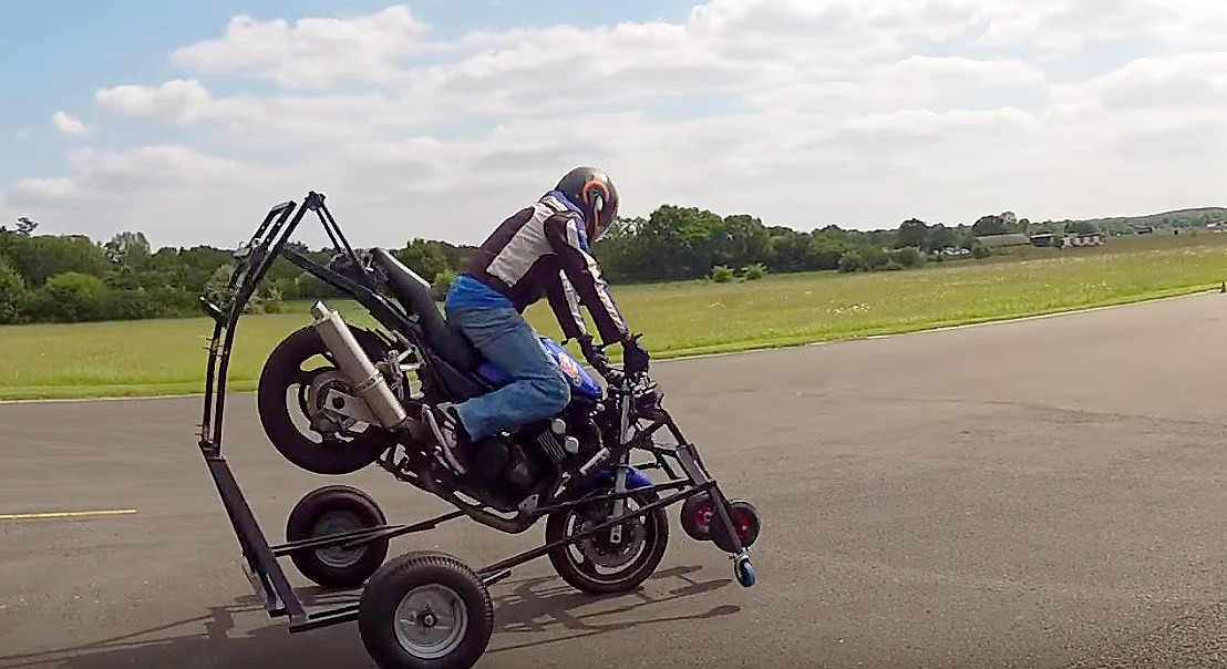 國外玩家設計了一套簡單的翹後輪教輔助系統,在車身焊上鐵架並且搭配輔助輪,讓騎士在執行翹後輪的動作時,前小輪與後支架會限制住翹的最大幅度以防止翻過去的情況發生。而側面有兩個輔助輪與車架相連防止在翹的同時左右傾倒。有這機構後就可以全心全意無顧慮的翹了!國內的玩家是不是也該來悍一組玩玩。
