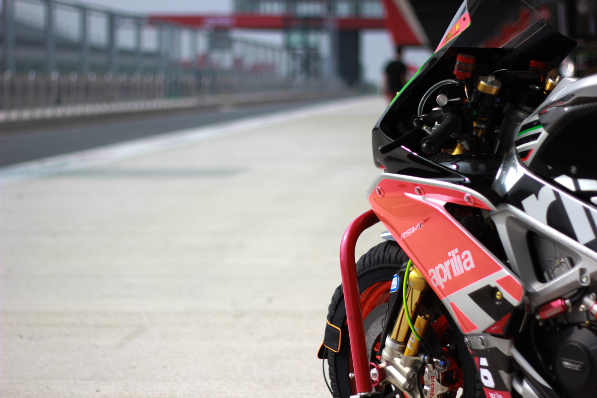 雖然還有諸如Dorsoduro與SRV等絕美作品的推出,但在這間以黑紅色為基調的義大利車廠裡,反而所謂「主流」,便是混合著辛烷值與極高的轉速,在行之有年的諸多V4引擎之中霸道橫行的當家主力跑車RSV4與性能街車Tuono V4。宛若GP廠車的運轉聲浪,造型絕美的歐系設計,當然,電控與硬體配備也給的毫不手軟。這是APRILIA,一間浪漫,卻快的嚇人的頂級車廠,在11月尚處秋高氣爽的麗寶賽道上,APRILIA總代理摩托之星舉辦的賽道日,早上八點的暖陽照耀的,是一家老小的歡笑聲後映襯著眾V4引擎的咆哮,雖然這樣說有些違和,但在麗寶賽道的Pit區,竟也成了一幅熱血又溫馨的畫面。