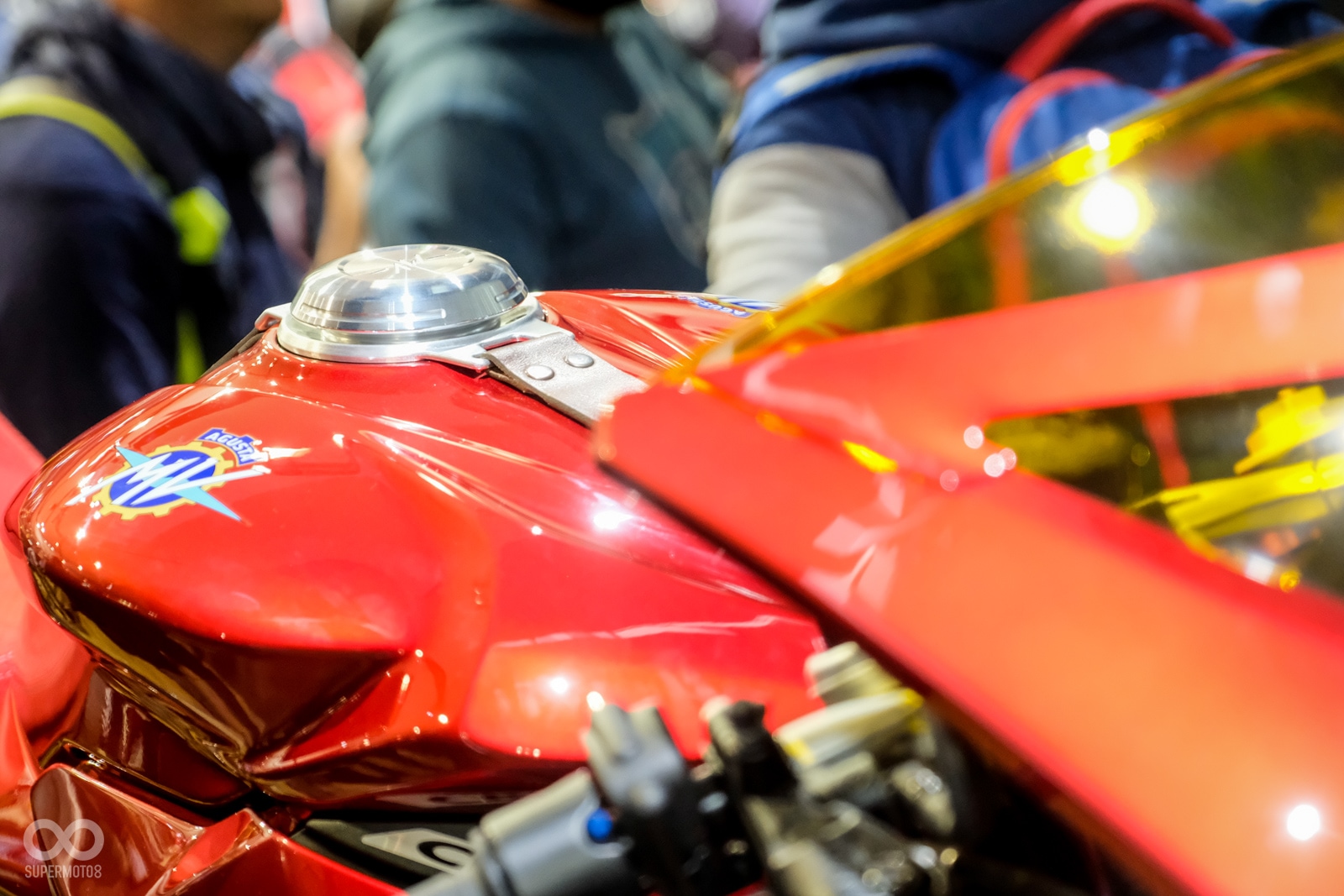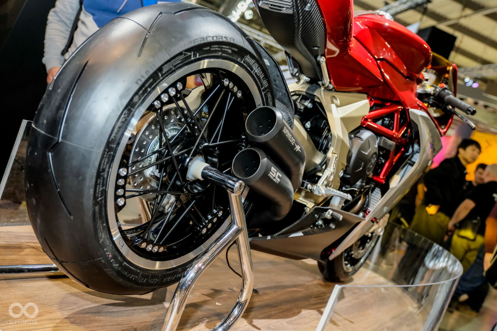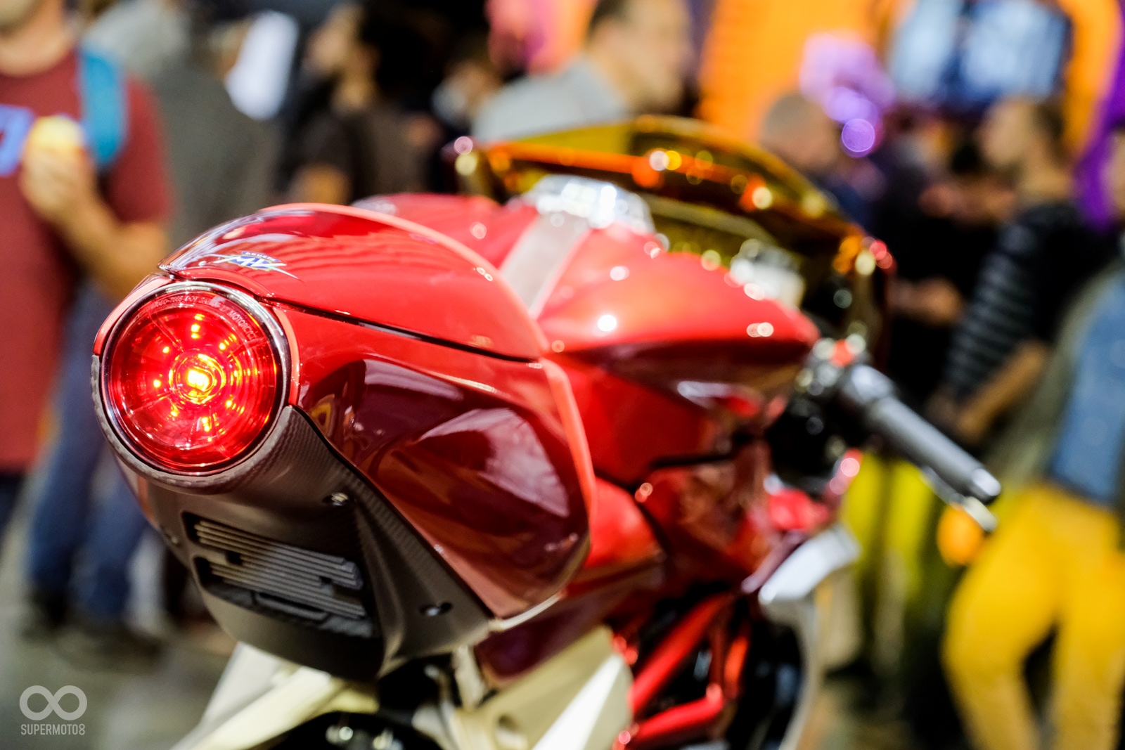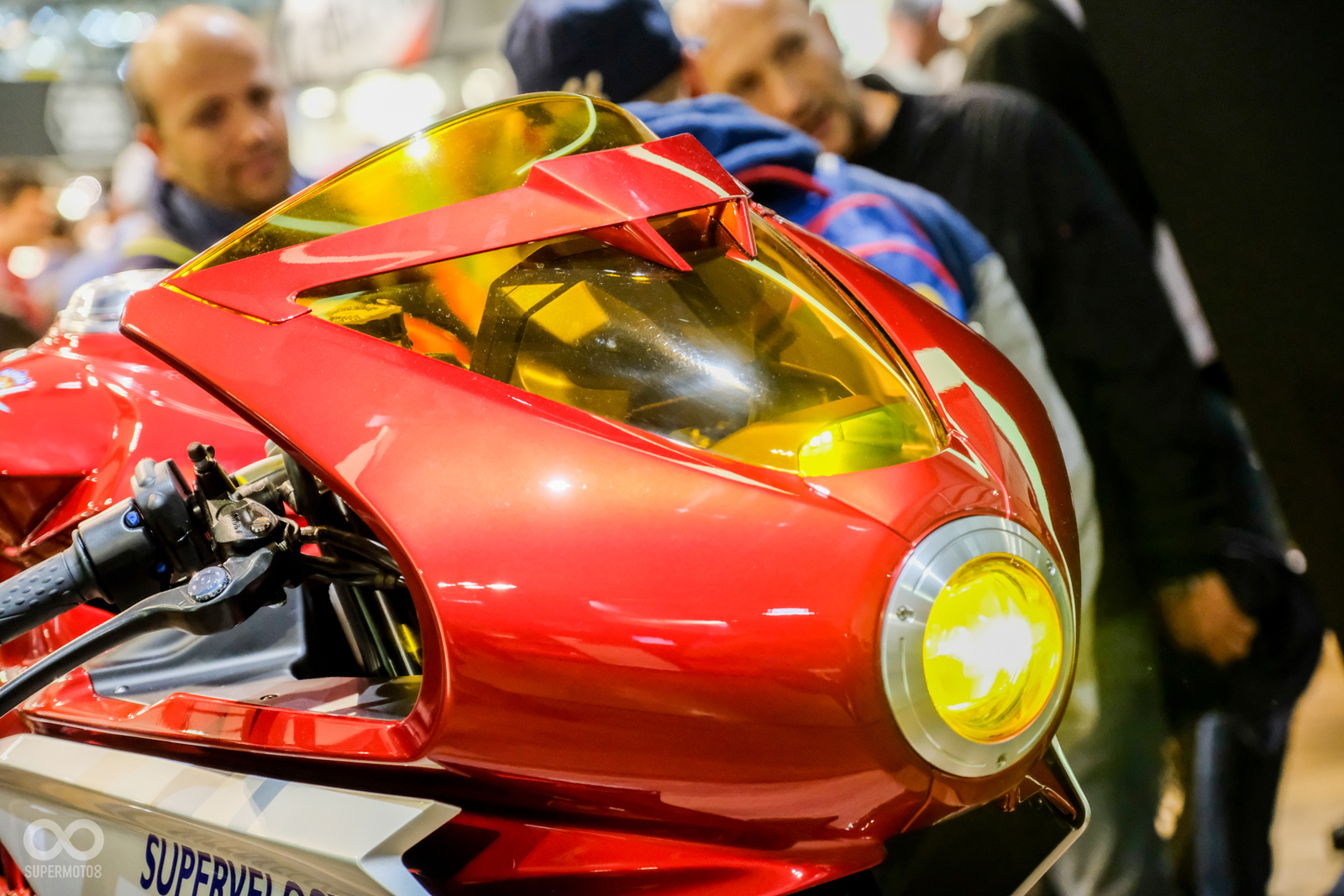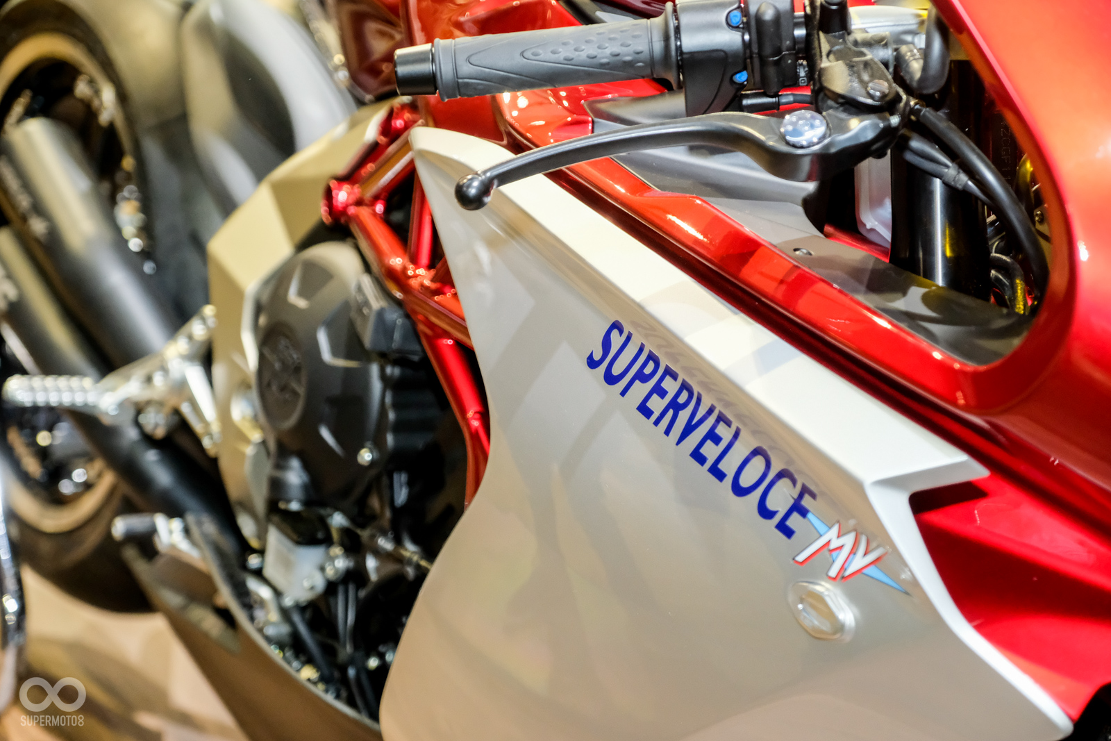既然談到MV Agusta F3 800 Superveloce,於今年米蘭車展中這輛還是以概念車之姿展示的街車,過度探討規格細節似乎有點無聊,但是於展場中實際欣賞這輛帶有子彈頭罩的精美街車全車被碳纖維整流罩包覆,車頭燈與前風鏡採用老味十足的黃色塗裝,配上性感的單搖臂與短排氣管,加上尾部的圓形LED尾燈,整體復古、前衛的質感拿捏的恰到好處。