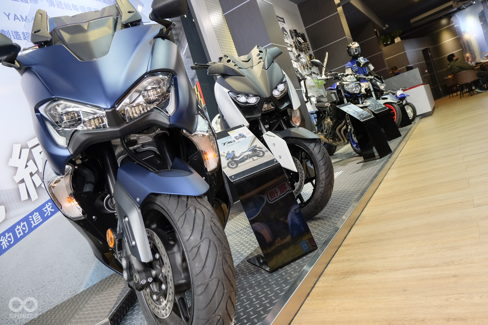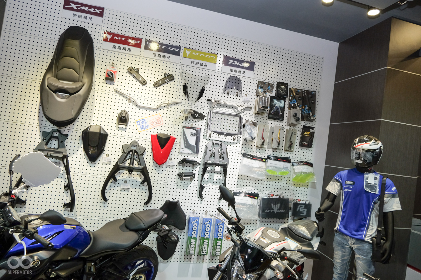 除了放鬆享受之外,店內也擺放了非常多的改裝套件,以及YAMAHA的原廠周邊商品,一旁同時也展示了YAMAHA旗下的重機車款,所有車款一字排開的近距離展示,讓消費者能更貼近了解這些產品。