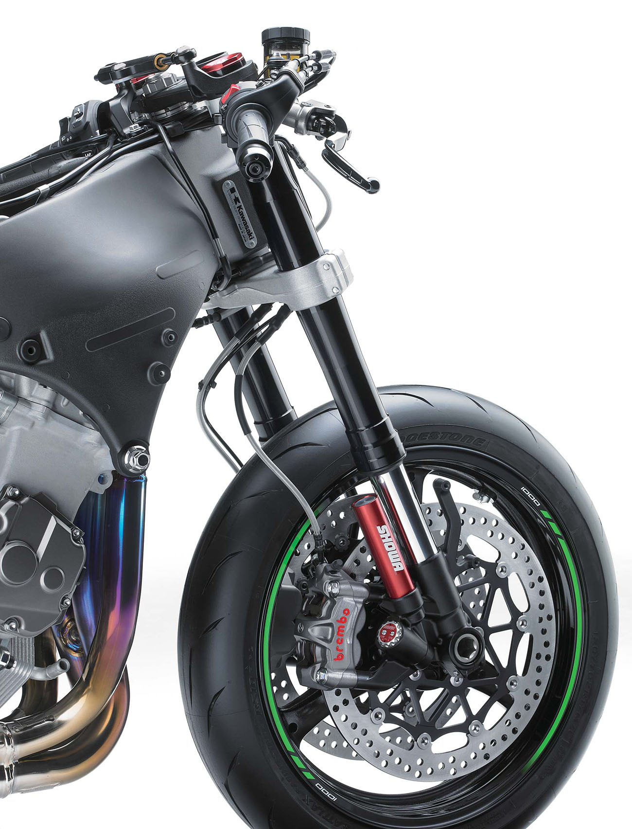 由Showa與WSBK廠隊合作開發,這支倒立前叉導入了BFRC自主平衡系統,兩支單筒不僅有獨立的氣瓶、獨立的調整係數,整合起來的調整空間更比一般前叉更大;而前煞車系統搭配的是兩片Brembo M50 330mm碟盤,搭配鋁製單體對向四活塞卡鉗,碟盤在邊緣也增加散熱凹槽,降低熱衰竭的發生;而後避震筒也是配有BFRC功能的Showa減震筒。全新ZX-10R更將後搖臂拉長15.8mm,主要是要讓騎乘重心更趨近前輪,增加彎前煞車和入彎的穩定。後輪煞車則為220mm單碟配單活塞卡鉗。