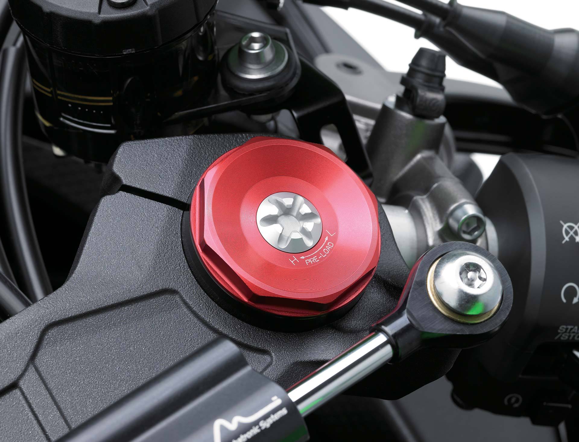 新年式ZX-10R首度搭載帶著氣瓶的Showa倒立前叉,超越了一般旗艦市售車在前叉電子控制的規格,當然外觀上也更具旗艦模樣。