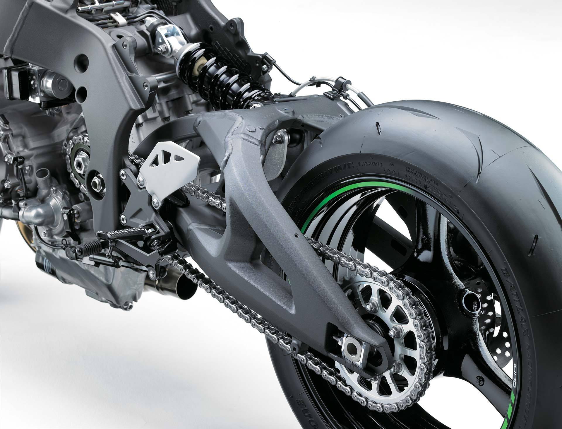 鈦合金大幅的運用讓引擎強度更佳,包含進排氣門、排氣管全段與消聲器都是鈦合金的輕量與強化,頭段與比賽廠車口徑相同,賽道可很快速的換管直上,至於法規部分則是以三個觸媒轉化器來通過歐盟四期法規。散熱部分,冷卻管線與空濾同步放大,將上前整流罩針對Ram Air進氣效果的提升,讓新世代ZX-10R在低轉速推進到中高轉更加緊湊,而新一代的離合器也輕量了130g,並且在二到六檔齒比更密,反映出的加速性能是更犀利。