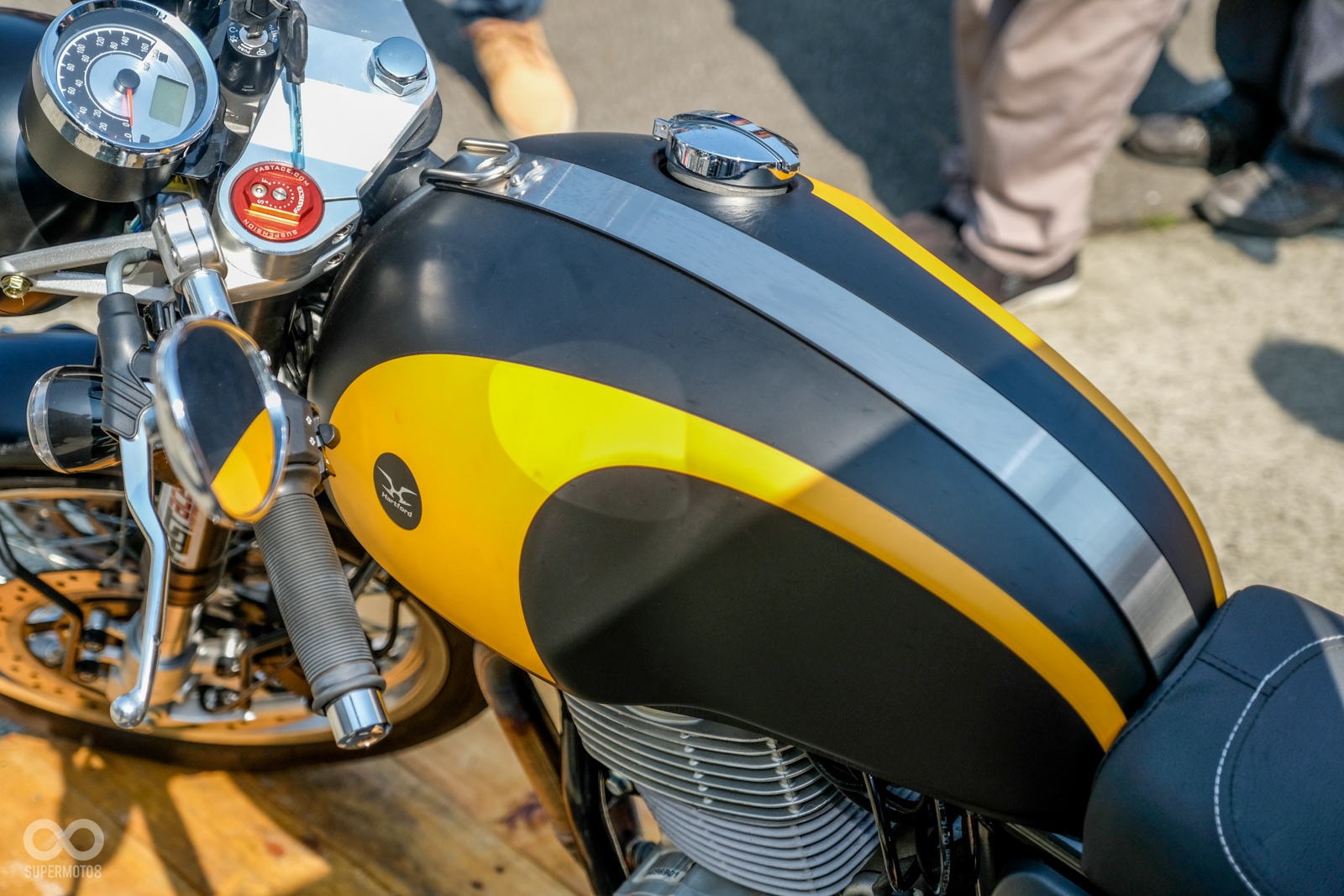 從油箱開始就能感受到這台大雲豹的細節,有著一條金屬固定帶以及不置中的油箱口設計,復古造型的油箱也承襲古典的腿夾曲線;車架採用搖籃式車架配上41芯法斯特可調整前倒叉,後雙槍的懸吊配置更強化了車體的穩定性,前煞車為雙碟配上雙輻射卡鉗,配備給的一點都不手軟。