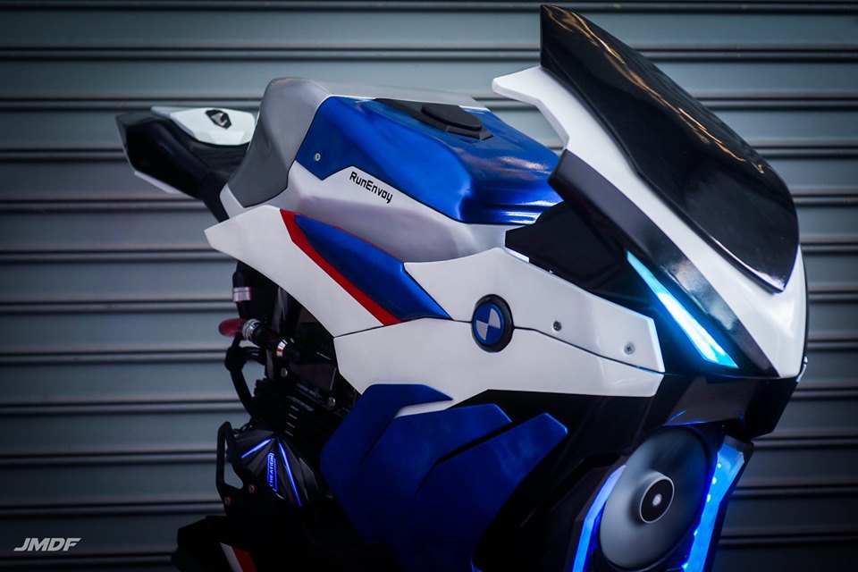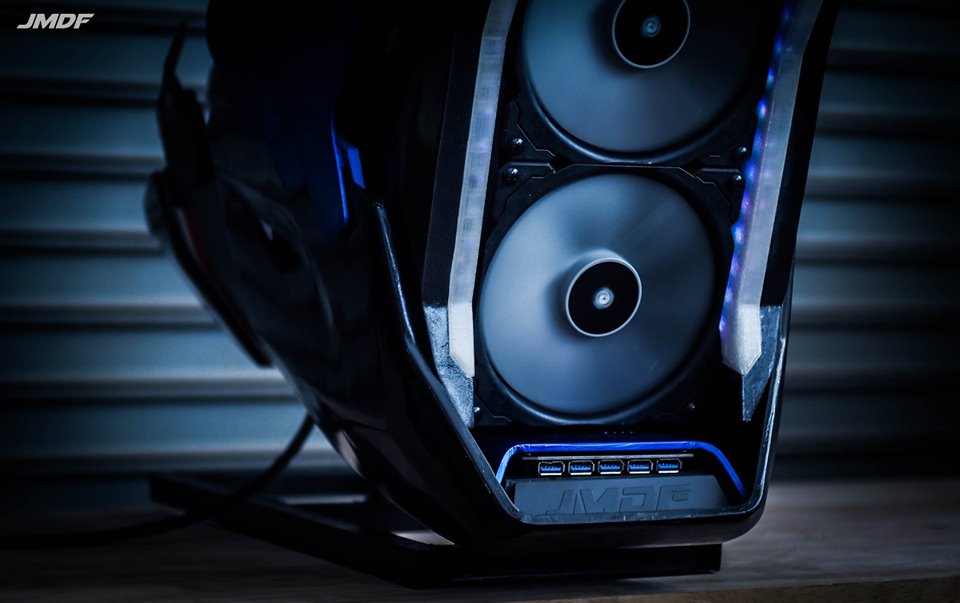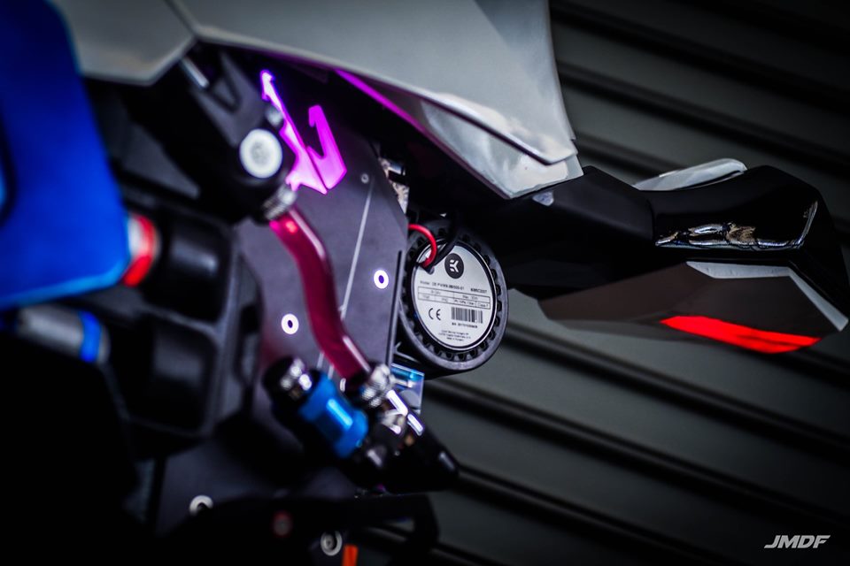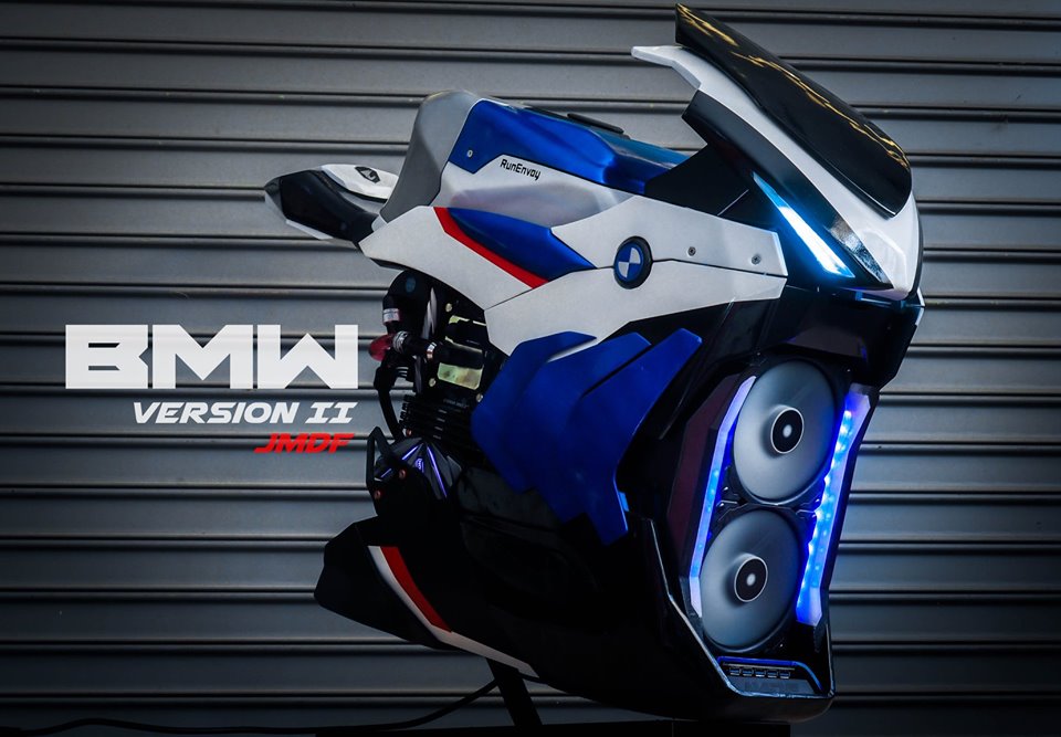 首先來看看這台BMW S1000RR的電腦,從車頭看去首先能看到相當帥氣的水冷排風扇矗立在前方,風扇上方更有相當完整的2019 S1000RR的車頭造型,就連左右兩側的鰭片也做得有模有樣,深藏在左右車殼內部,更有一組可動的汽缸部件,另外JMDF還利用了水冷管線、記憶體來營造出油管、鰭片的視覺效果,而油箱下方則是隱藏著電源供應器。