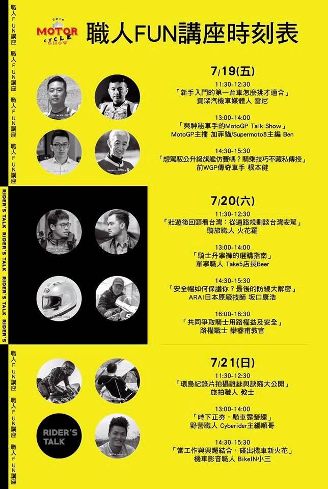 集結許多二輪界職人的「職人講堂」今年也會在展場二樓熱鬧開講,其中不乏專精於服裝、騎乘技巧、機車旅遊、機車影音拍攝職人與大家分享「眉角」!或許也有機會與你心中的偶像合照哦。