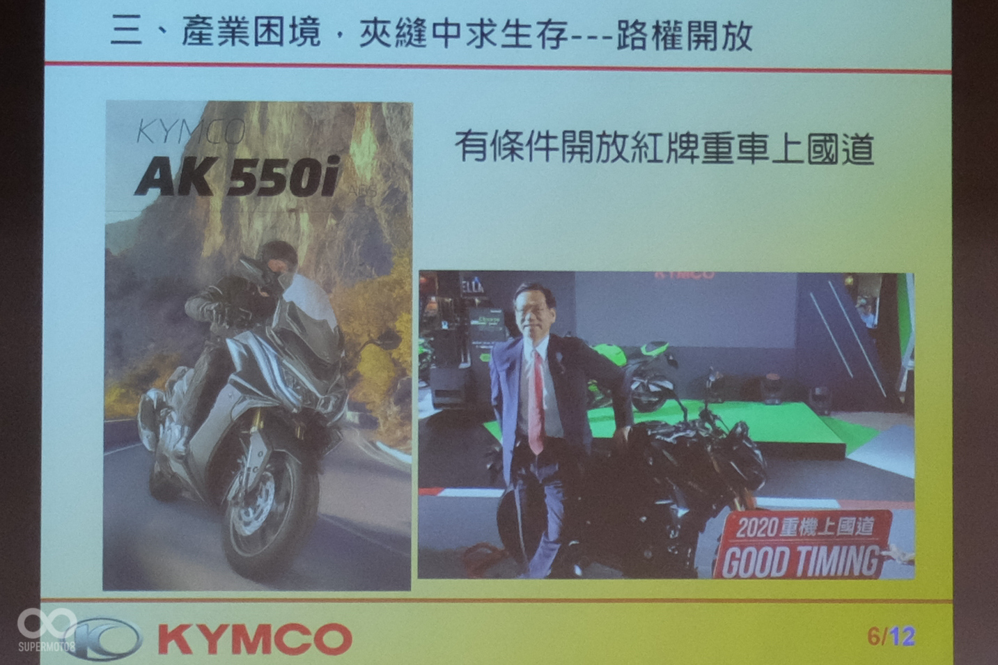 台灣自從開放快速道路路權以來,高速公路的路權一直沒有開放,這也導致國內車廠缺乏一個穩定的基礎市場來開發排氣量更大的重型機車車款;另外KYMCO執行長在與會時也提到,目前台灣的機車都有17%的貨物稅以及3%的營業稅,等於一台五萬元的車有一萬元是繳給政府,這些稅收過去是屬於奢侈稅的一部分,但如今機車早已不屬於奢侈品,柯俊斌執行長也建議政府可以鬆綁、調降部分的稅收,來加強國產車廠的市場競爭力,同時減輕消費者的購車負擔。