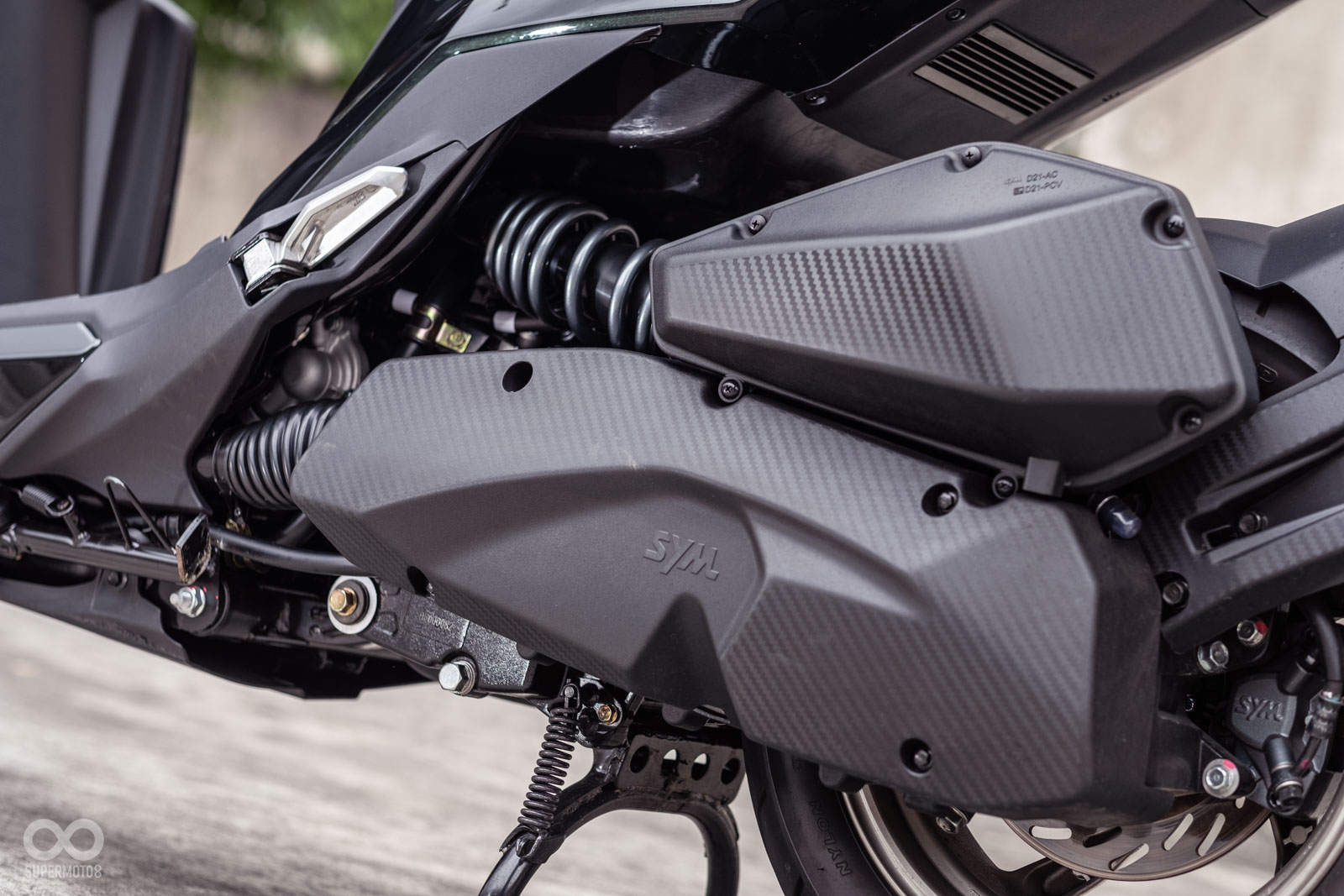 另外引擎、傳動蓋的部分,SYM也以獨特的外殼壓紋點綴,給予有如碳纖維改裝品的視覺雷同,此外排氣管的部分,同樣以短排氣設計,維持整車一貫的運動風格;車尾以懸浮式設計搭配U型LED燈、下置式土除方向燈,勾勒出跑格滿點的視覺感受,特別是懸浮式上揚的車尾,搭配上LED尾燈的組合,讓DRG 158在擁擠的都市車流當中,具備搶眼的車尾辨識度。