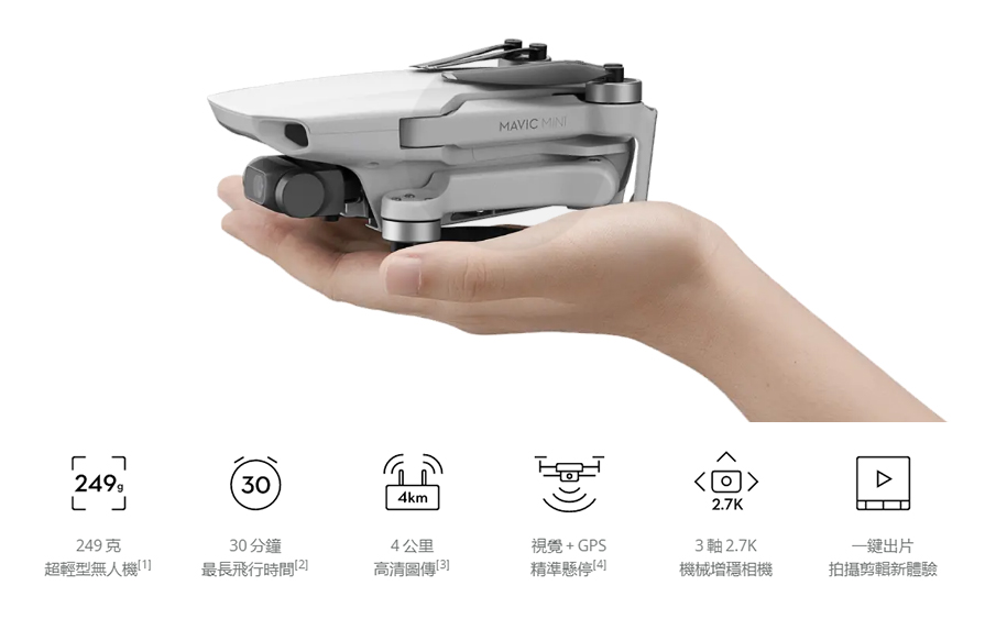 Mavic Mini麻雀雖小五臟俱全,收納起來小小一台跟手機差不多大,整機重量更是只有不到250克的249克,能避免近期上路的無人機登記法案,但別被這小小的身軀給騙了,Mavic Mini可是擁有四公里的高清圖傳、30分鐘航行的蓄電力、視覺+GPS精準懸停、三軸2.7K高度穩定鏡頭跟一鍵出片的強大軟體,目前台灣官網已經上架,但網站顯示為暫時缺貨目前無法下訂,Mavic Mini的標準套餐價格為12,000元。