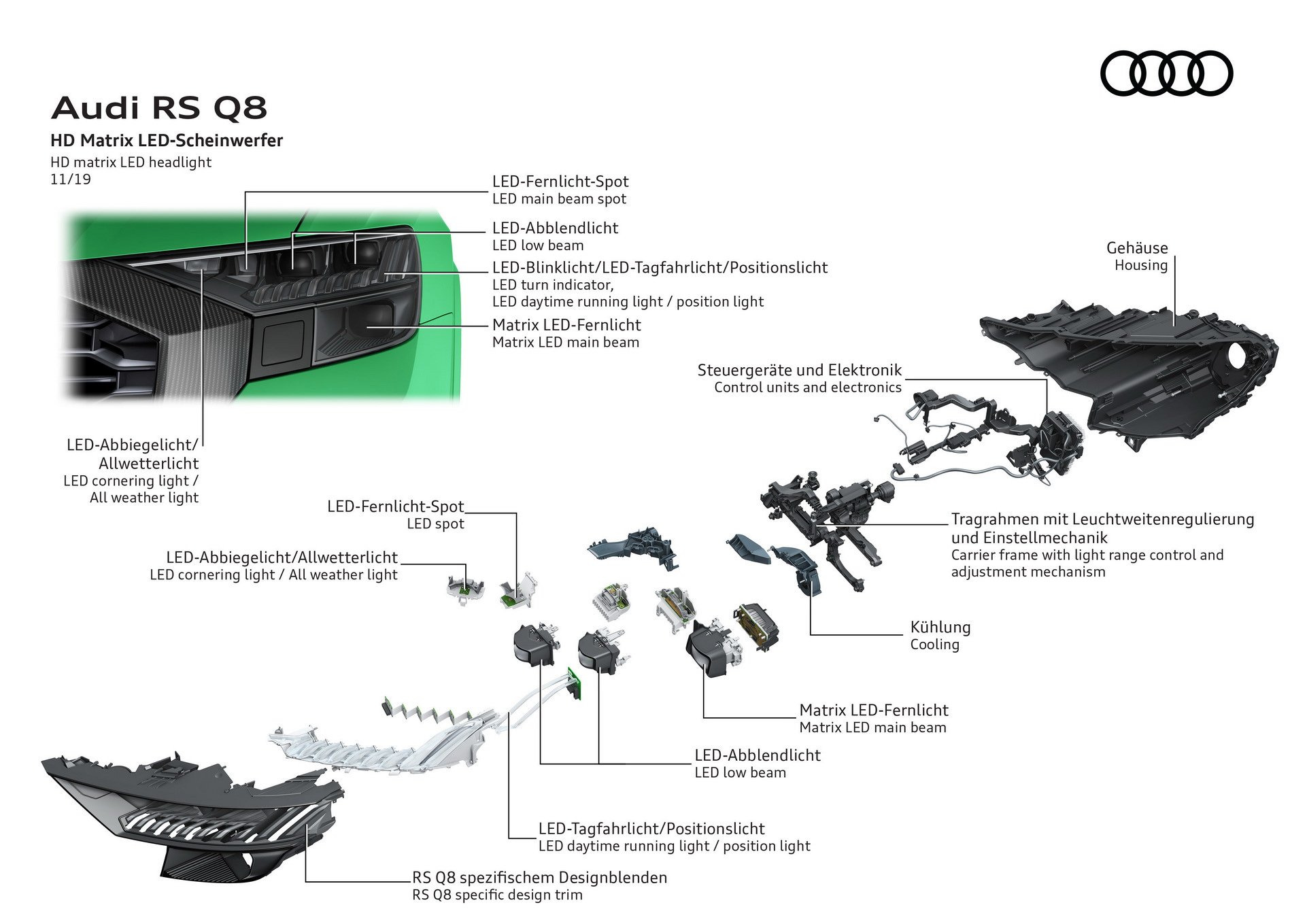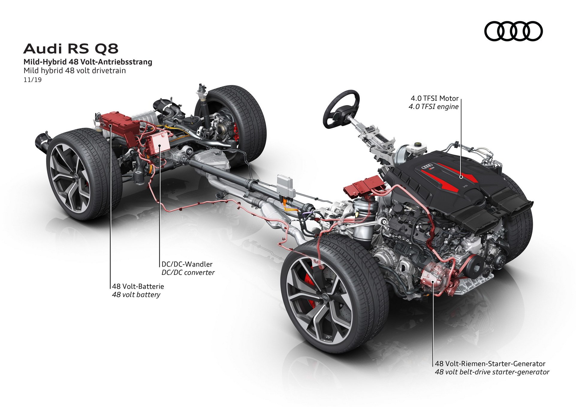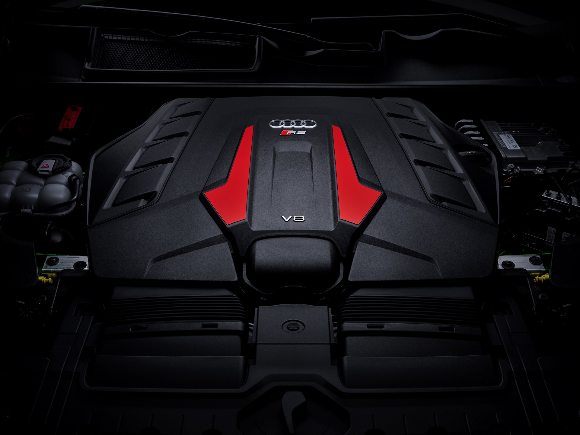Audi在今年又揭露了一輛全新的RS家族成員,RS Q8的動力心臟與RS6 Avant相同,4.0L V8雙渦輪增壓引擎加上48V輕油電複合動力系統,擁有600hp的最大馬力,其81.6kg-m的峰值扭力可在2200~4500rpm之間展現,搭配上8速Tiptronic變速箱以及quattro四驅系統可讓這輛車在3.8秒內完成百公里加速,200km/h加速則為13.7秒,極速微電子限速250km/h,如果再選砲Dynamic套件的話,則可來到305km/h之譜。