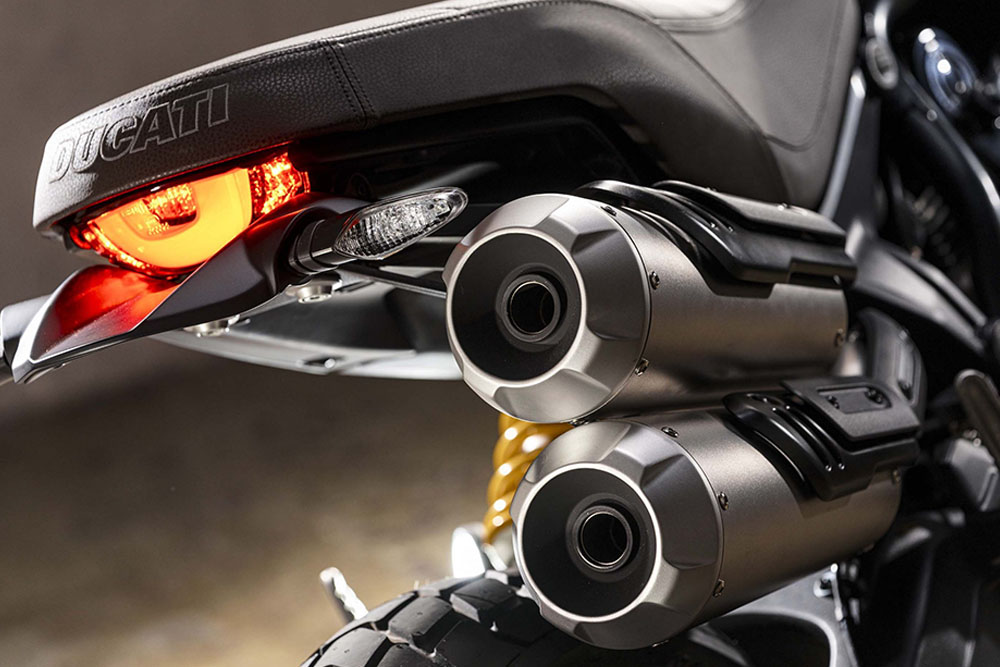 和上一代的Scrambler 1100最大的不同就是Ducati這次為了塑造出更完整、更獨特的Scrambler風格,將排氣管從單排氣管變成了雙排氣管的設計、牌架的部分也從上一代連著車尾的設計改成了位在下方的短牌架,讓整輛車更有Cafe Racer的復古感。