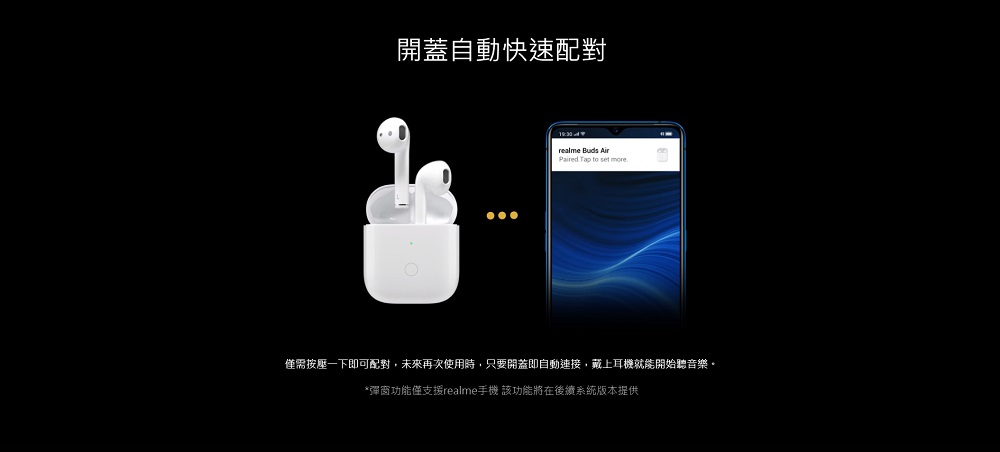 除了他的外觀設計和Airpods相同之外,他也同樣搭載了Airpods擁有的「開蓋自動配對」和「戴上播放」功能,讓使用者將耳機從充電盒取出戴上後可以立即使用,減少連線的延遲時間。