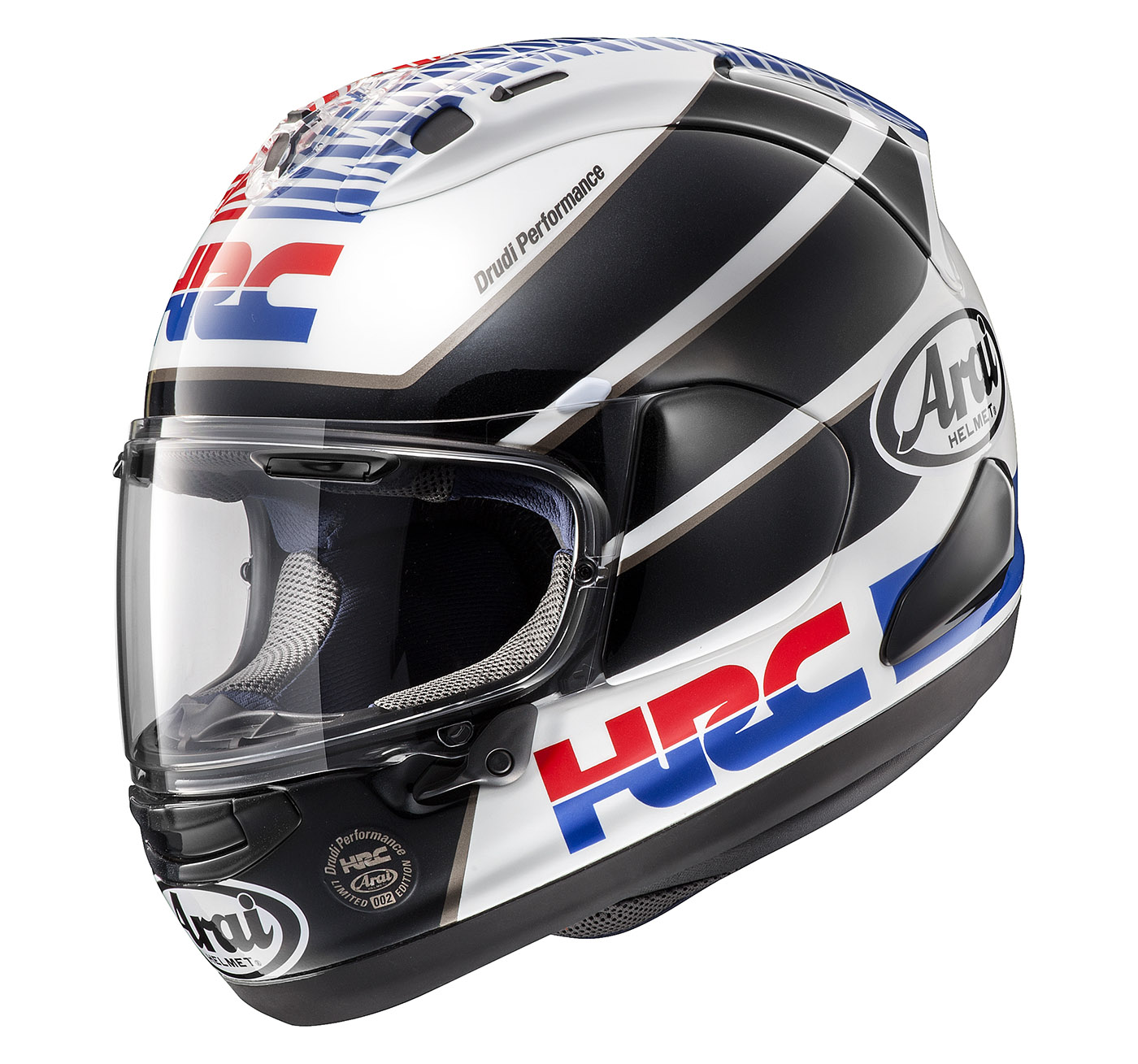 知名日本安全帽廠Arai,在近日(2016/5月)對外發表頂級帽款RX-7X(歐洲地區型號稱為RX-7V)最新採繪塗裝。這次發表的塗裝特別與同為日本的經典品牌的HONDA合作,將旗下HRC彩繪式樣塗裝上身,除了擁有紅藍白HRC招牌配色與醒目LOGO外,更運用HONDA經典的翅膀圖案貫穿兩側,完全呈現本田的熱血靈魂。