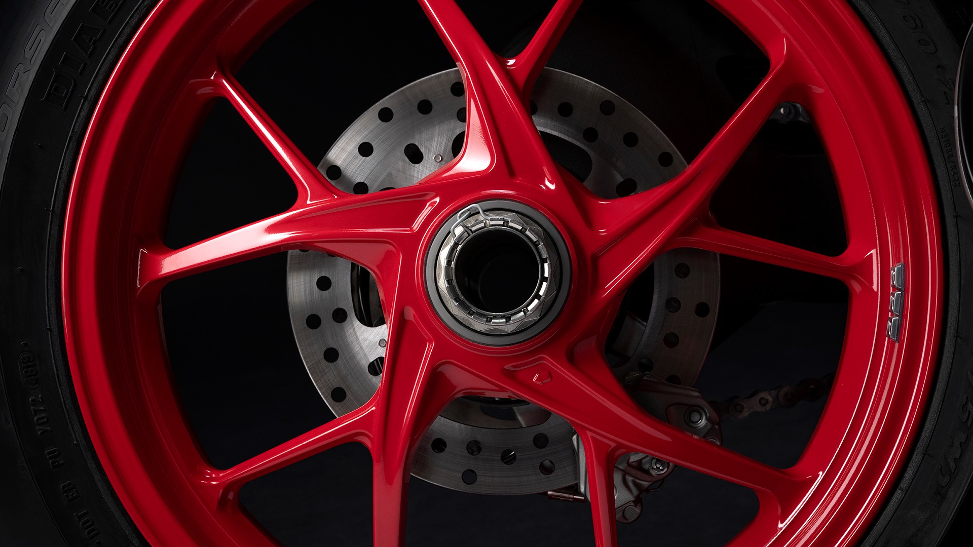 作為Borgo Panigale工廠生產的DUCATI Panigale 系列車款,在V4、V2統一的家族外觀設定上而言,其實不從車身標示來看你真的很難猜到眼前的究竟是V2,還是V4車型。而全新的White Rosso配色更是從原本競賽靈魂強烈的DUCATI當家經典紅當中再衍伸出的絲綢白色,有別於整流罩的絲綢白,輪框鋁圈的部分則是用上了原本的經典紅色來襯托,遠看相當醒目且霸氣之外,近看更是精緻的令人屏息。