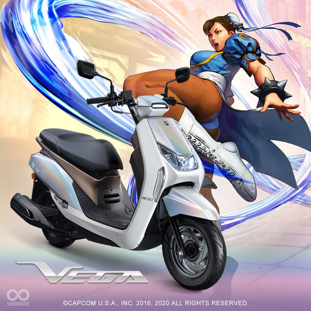 身為三款車中,較偏向女性、都會通勤代步的SYM VEGA,如果你熟悉快打旋風V,我想你已經可以猜到代言角色會是誰!答案就是許多人在遊戲中也相當愛用的「春麗」與幻彩銀的VEGA。
