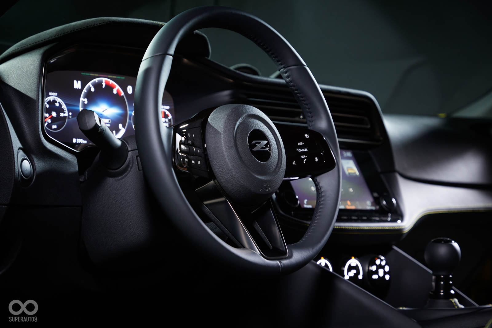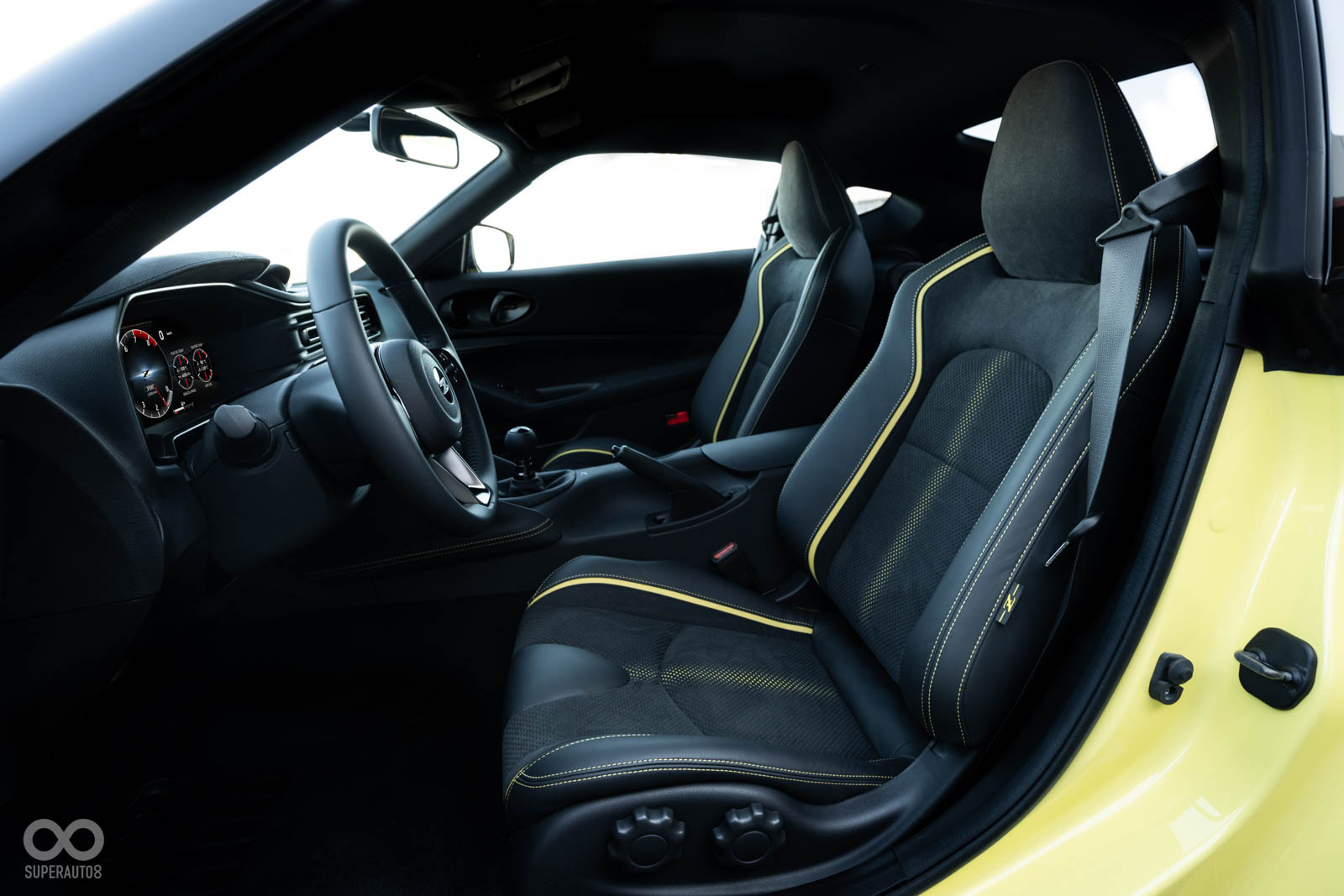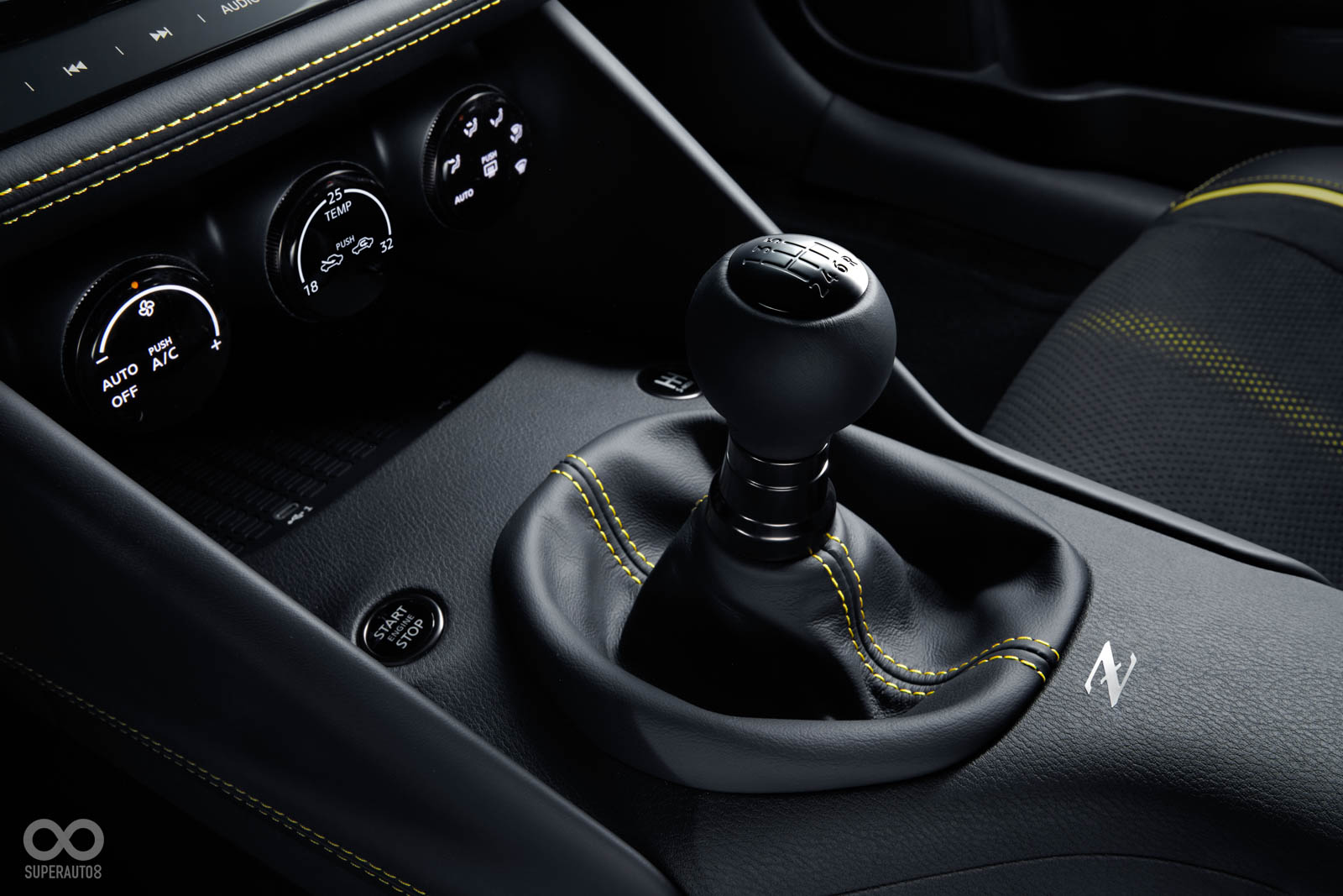 內裝則是更有趣的地方,雖然可以清楚看到中央與儀表各有數位螢幕,但一旁的三環錶依舊以傳統儀表形式豎立於上,車內也加入大量黃色裝飾點綴。另外你有注意到中央的6速手排排檔桿嗎?這幾乎代表未來的Z車型,依舊會有手排選項提供給消費者。