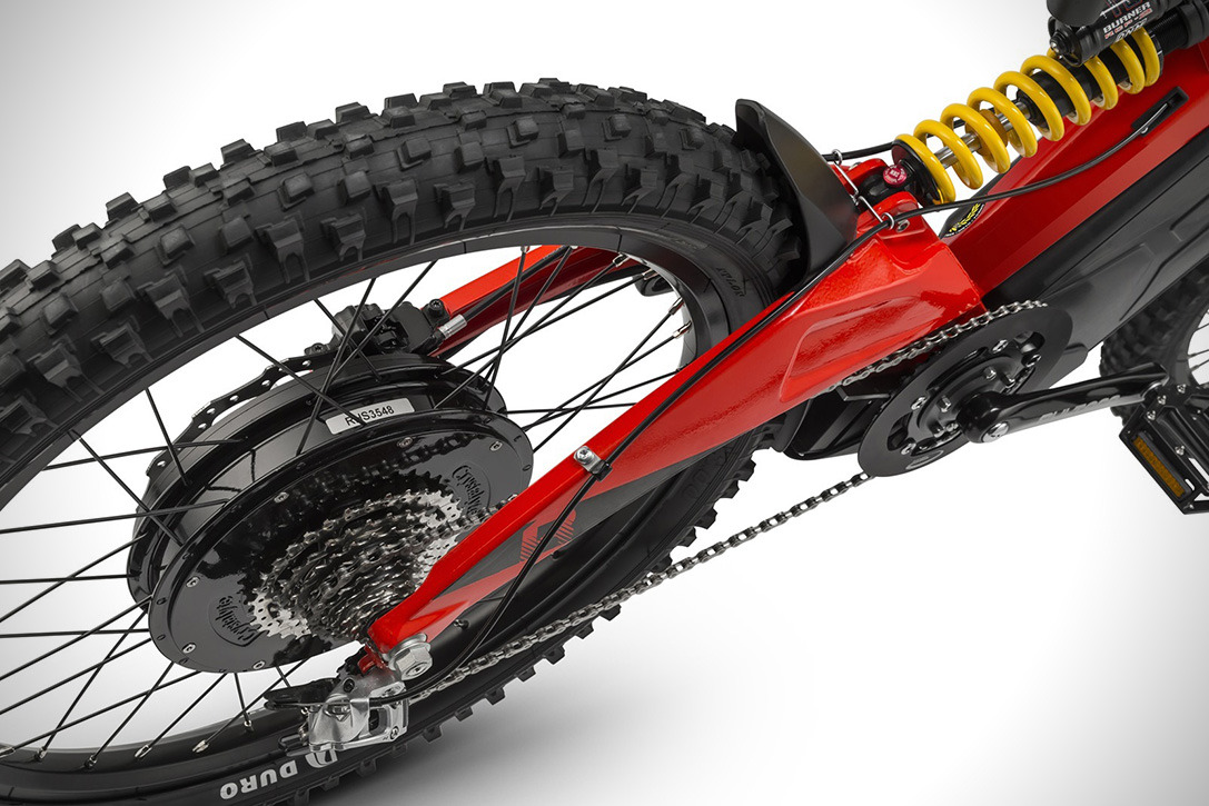 Brinco R的基礎是自行車,計車架與懸吊融入機車概念。如果只看車架,會誤以為這是一輛特技機車,鋁合金打造的車架與海鷗後搖臂,完全以機車結構作為設計範本,坐墊則固定在由主車架延伸的副車架上。懸吊配有倒立式前叉與中置單鎗後避震器,煞車則是前後輪配置203mm碟煞系統,如果把自行車腳踏板拿掉,活脫就是一輛越野機車。