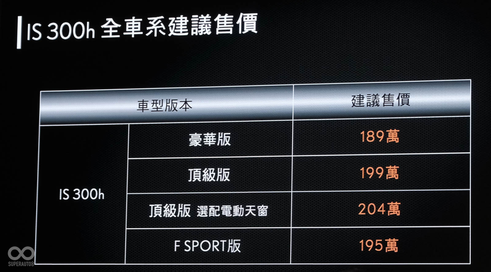 LEXUS總代理和泰汽車在今(10/16)日發表全新改款IS300h,新世代外型設計、Hybrid油電混合動力導入、安全科技配備升級,同時透過在Shimoyama測試中心的研發提升操控性能,LEXUS IS300h是兼顧熱血與實用的性能房車,LEXUS今日也公布IS300h三款車型的正式售價,分別為豪華版189萬、頂級版199萬、F SPORT版195萬。