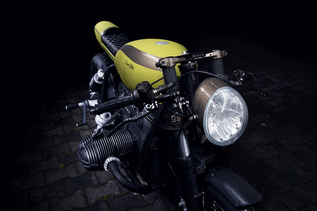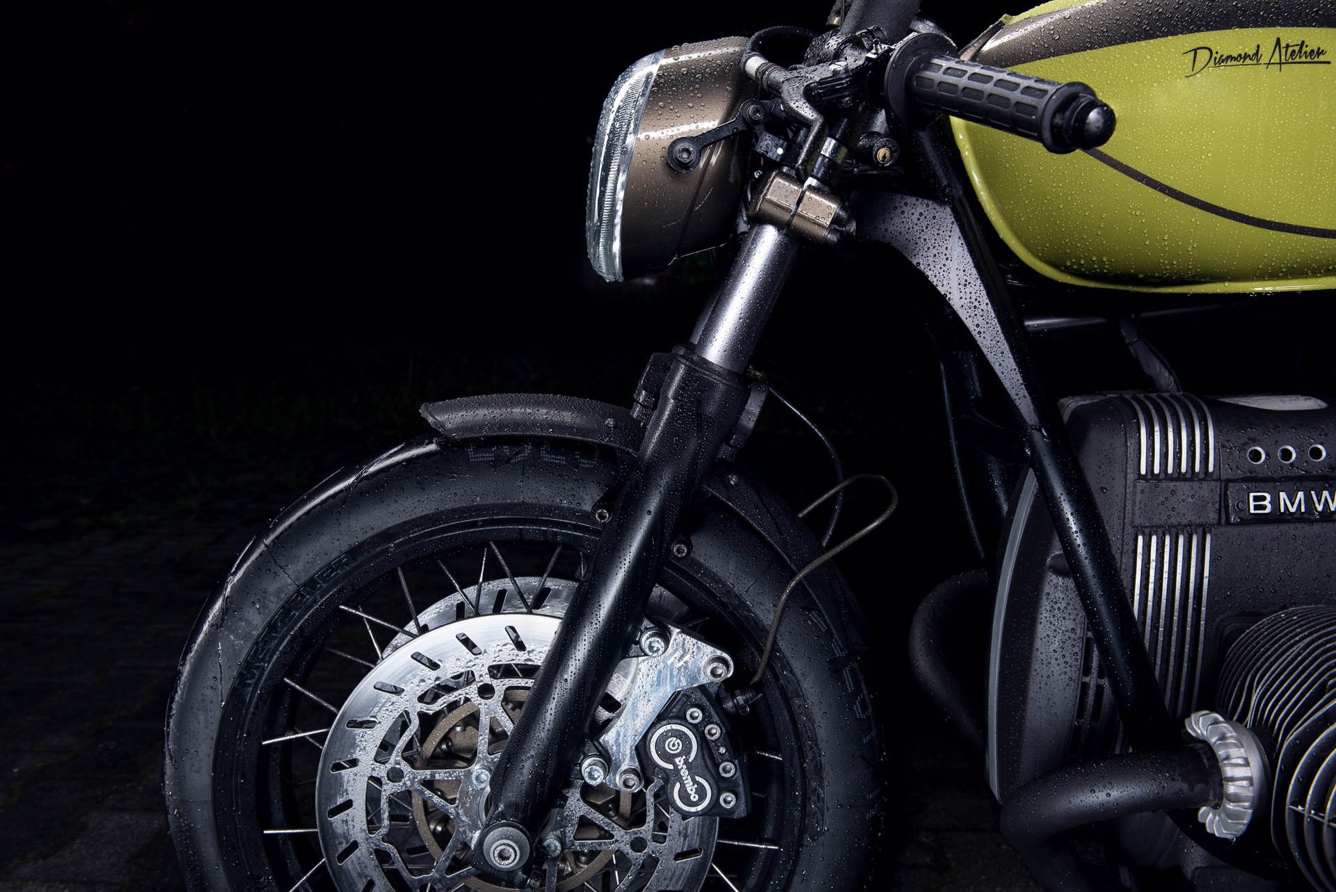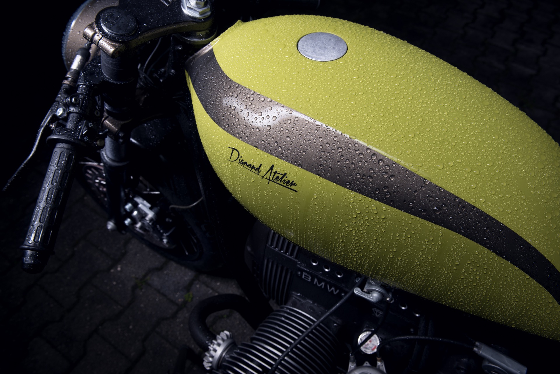 BMW R100R由1991年開始上市至1995年停產,引擎採用當家R系列的水平對臥雙缸氣冷引擎,排氣量980c.c,最大馬力60hp,總重218kg,最特別的是後懸吊為側置單鎗避震器。鑽石工作室的改裝手法是保留車輛的原有特色,將外形修飾得更簡約,最後加點跑車風格,將一輛街車變身為CAFÉ RACER。