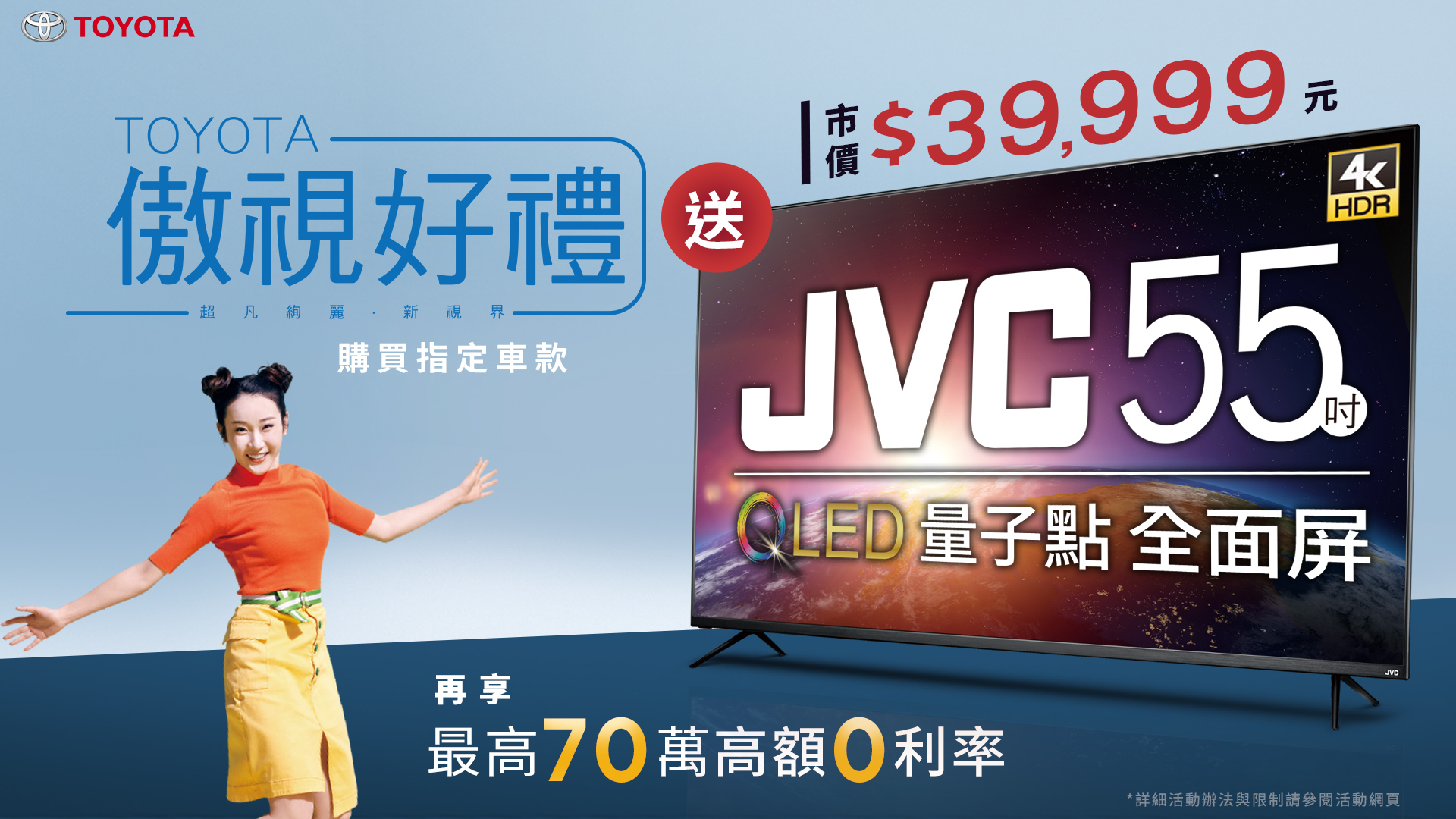 年底車市強強滾,為感謝廣大消費者的支持與愛護,TOYOTA台灣總代理和泰汽車12月份推出限量「TOYOTA 傲視好禮大方送」註1活動,本月購買指定車款,就送JVC 55吋QLED量子點全面屏(市價新台幣39,999元)。本次交車禮搭載QLED金屬量子點顯色科技,結合HDRextra超高動態對比,能呈現超越100%極廣色域,帶來超凡絢麗的視覺效果,「多段可調式智能防眩抗藍光」護眼科技,亦可最高降低70%的藍光,享受高畫質的同時亦可保護眼睛註2。