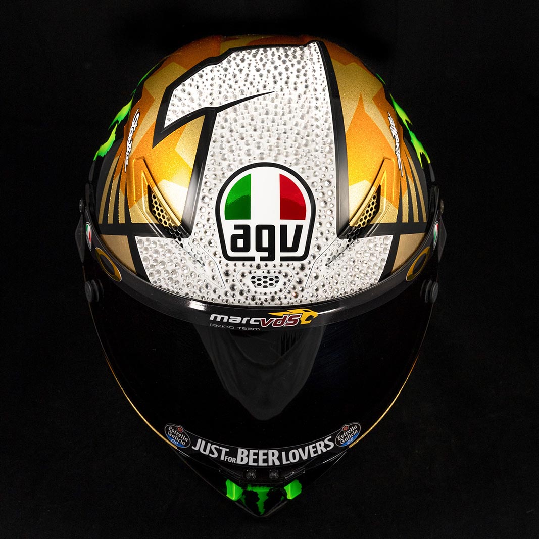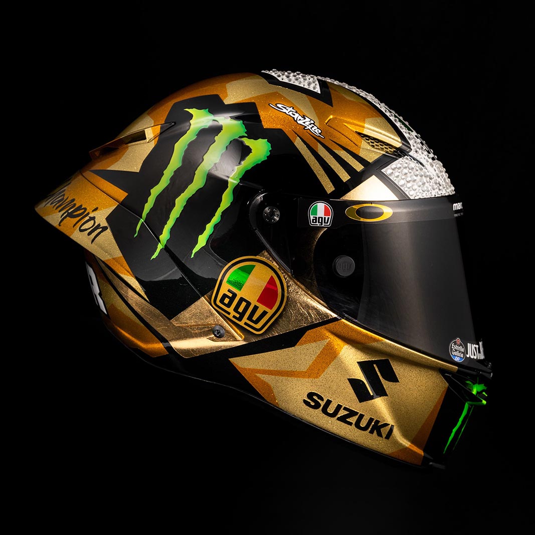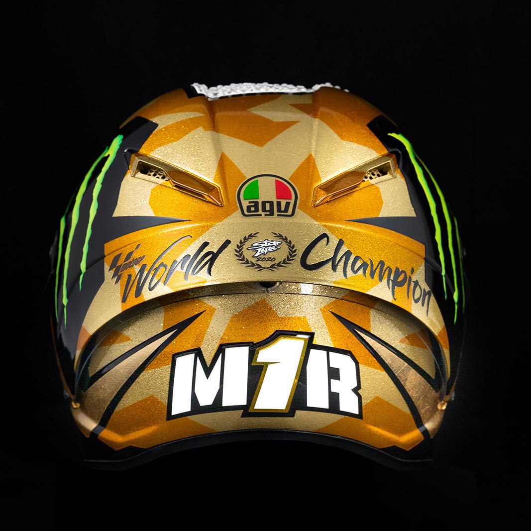 這頂金色安全帽不僅僅擁有特殊塗裝,在彩繪風格上更是細節滿滿,延續Joan Mir 2017年奪下Moto3年度車手冠軍時的全金色塗裝,但2020版本則是少了些奢華,多了些繽紛與內斂,雖然整頂冠軍帽依舊使用金色作為主打配色,但上頭斗大的白色1彰顯冠軍身份,後鴨尾則可看到冠軍字樣,搭配下方高調的「M1R」字樣,呈現出世界冠軍的氣勢。兩側斗大的Monster Logo證明贊助商也為這位世界冠軍付出不少努力與資金,金色烤漆也加入大量金粉,呈現出冠軍不一樣的價值。