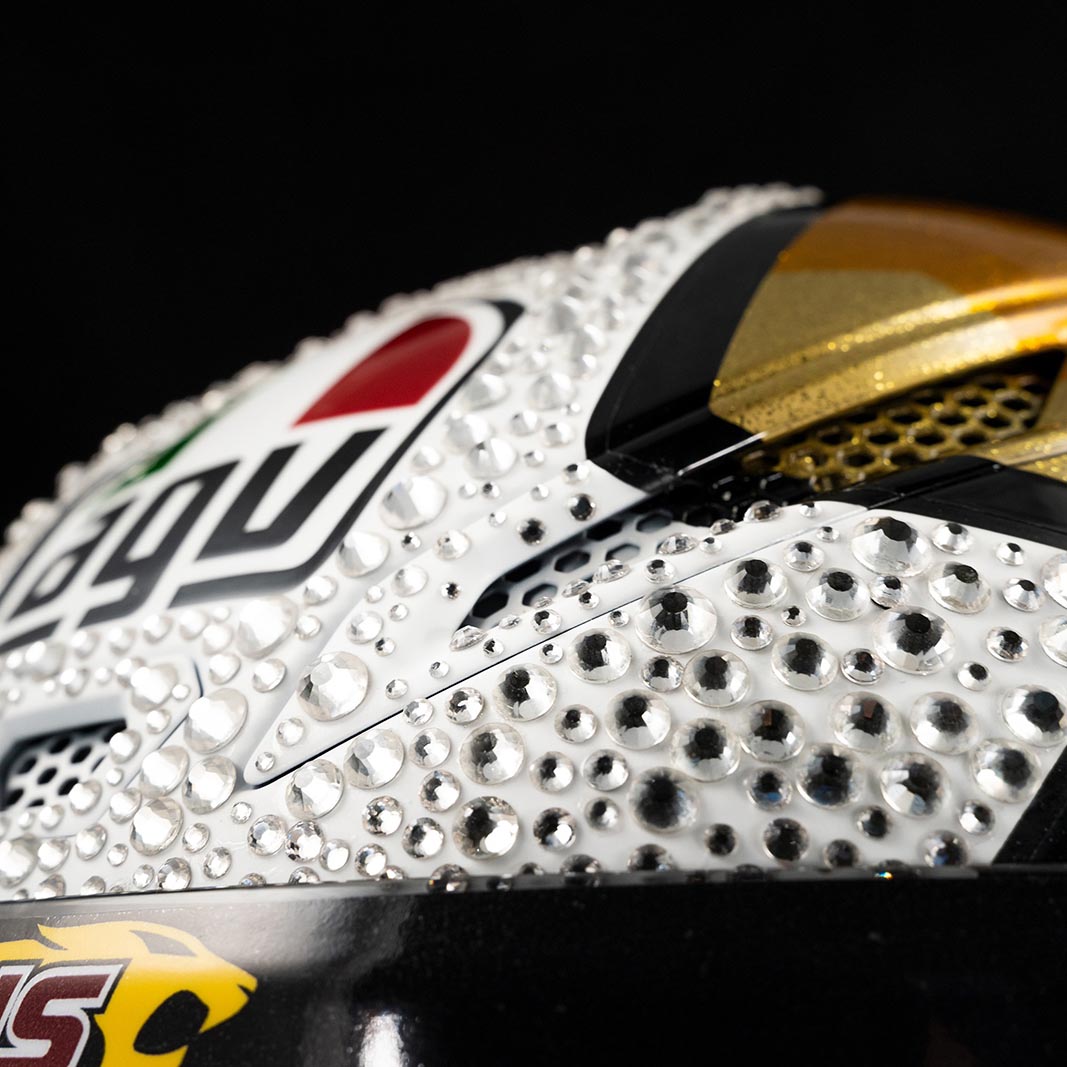 或許我們在轉撥畫面當下,認為本次冠軍安全帽塗裝略為低調,透過AGV的官方照片我們進一步發現,在白色的數字『1』部分,上頭竟然手工貼滿大量的水鑽,仔細看還會發現水鑽有著大小顆之分,視覺效果相當驚人。