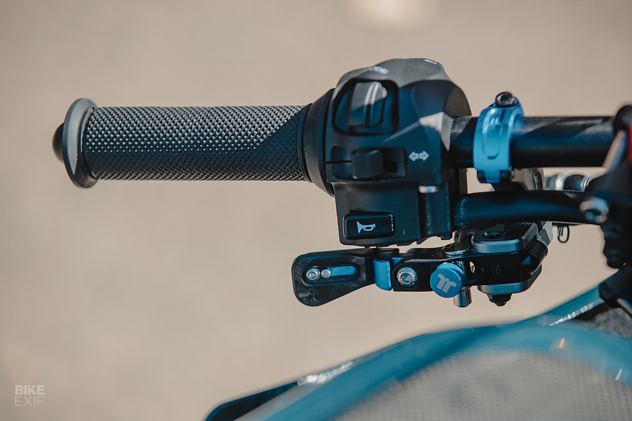 也因為Woolie是以比賽使用的車輛做為開發初衷,所以在ZERO SR/S 車上你可以看到些高規硬體配備。SHOWA WSBK廠車規格的懸吊系統、前後整組輕量化Dymag碳纖維輪框、訂製的Attack Racing輕量化切削三角台、J.Juan Racing制動、CNC加工的卡鉗座搭配Banke Performance後卡鉗以及OEM的前轉子,因為電動車沒有離合器,所以Woolie決定在左手把處加裝了賽事用的拇指剎車簡化煞車控制操作。