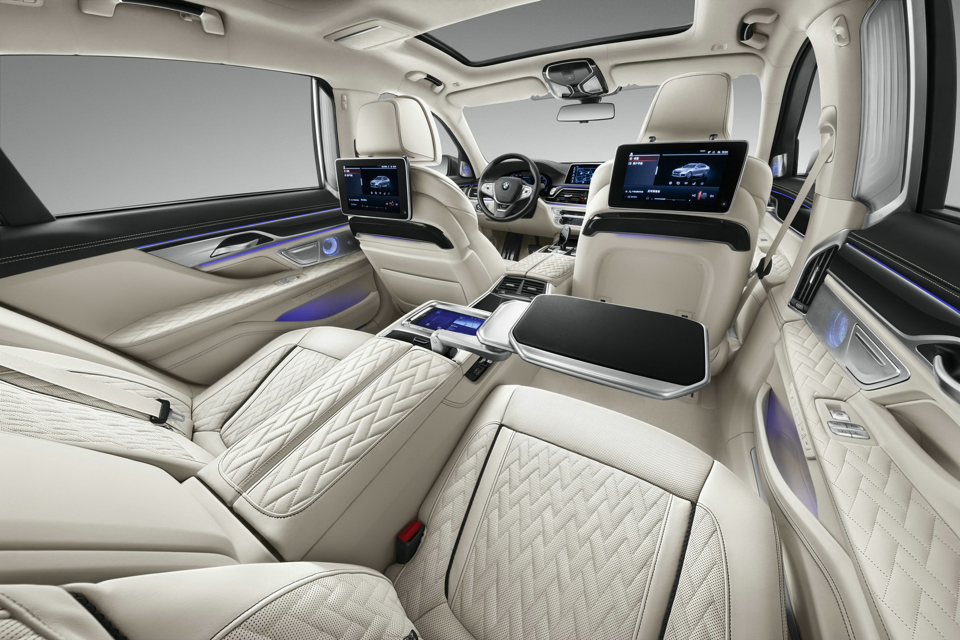 不過,原廠保所有時間都花在外部的工法,內裝則維持原樣沒有做太大的變動。內部已訂製的高檔皮革包覆所有部件,並以鑽石圖案施作特殊縫線,中控台、中央鞍座合門板再結合黑色鋼琴烤漆木飾板來點綴。後排座椅是此車的精華所在,具備電動可調座椅、摺疊桌板、按摩功能等奢華配備。除此之外,還有10.25吋的專屬螢幕與高檔揚聲器,營造出聽覺、視覺、觸覺的最高饗宴。這輛名為760Li Shining Shadow Special Edition特仕車起標價格為260萬元人民幣,折合美金約40萬美元